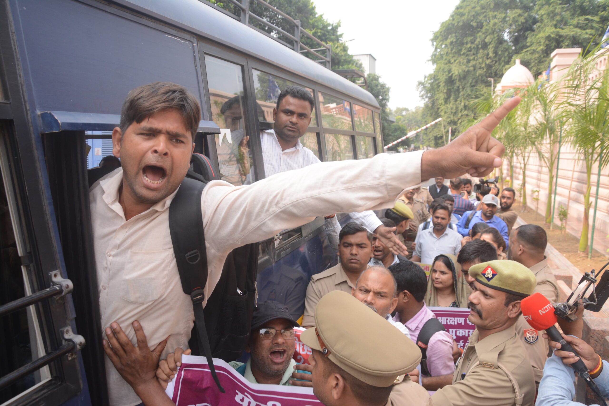 69 हजार शिक्षक भर्ती के अभ्यर्थी सुप्रीम कोर्ट में उत्तर प्रदेश सरकार द्वारा पैरवी न करने से आन्दोलित हैं। अभ्यर्थी प्रतिदिन किसी न किसी नेता के आवास के समक्ष प्रदर्शन करते हैं। आज बसपा अध्यक्ष के आवास के सामने प्रदर्शन शुरू होते ही बड़ी संख्या में पुलिस फोर्स पहुंची और उन्हें रोकने का प्रयास किया। अभ्यर्थियों ने यहां पर जोरदार नारेबाजी की। पुलिस ने अभ्यर्थियों को बस में बैठाकर इको गार्डेन ले गयी।