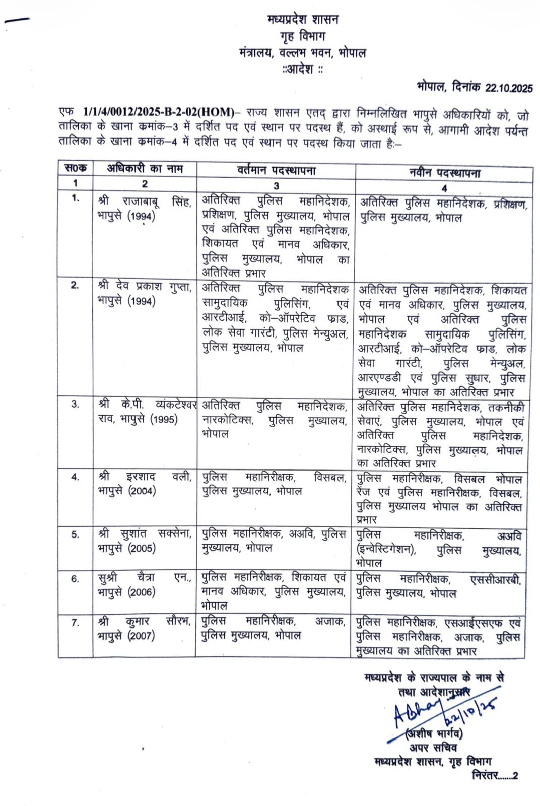 इसके अलावा, आईजी ईओडब्ल्यू भोपाल सुशांत सक्सेना को आईजी इन्वेस्टिगेशन पीएचक्यू, आईजी चैत्रा एन को आईजी एससीआरबी पीएचक्यू, और आईजी कुमार सौरभ को आईजी एसआईएसएफ एवं आजाक का अतिरिक्त प्रभार सौंपा गया है।