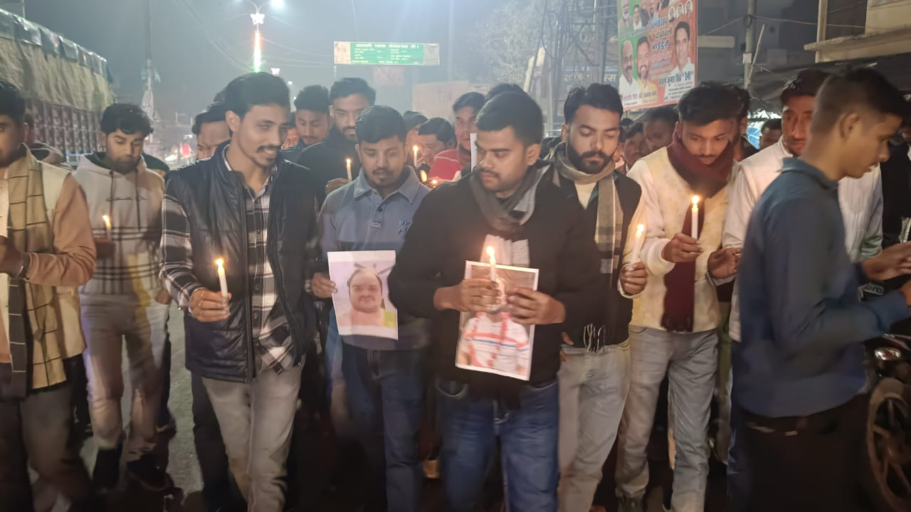 जलालाबाद चौराहे पर 2 मिनट मौन धारण करने के पश्चात् कैंडिल मार्च निकाला गया सौरभ वर्मा राजन गुप्ता निकुंज गुप्ता के सम्मान में दो मिनट के लिए मौन रखकर कैंडल मार्च निकाला गया।