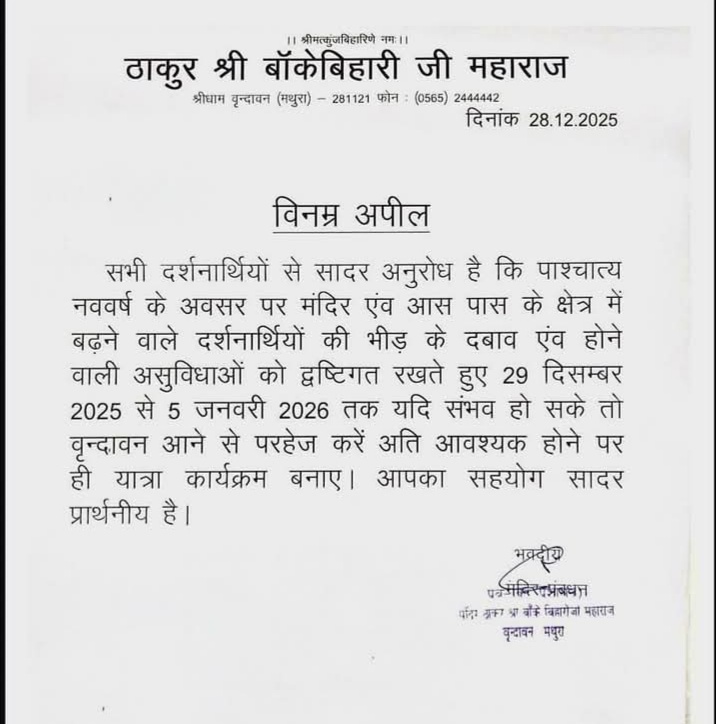 प्रशासन ने श्रद्धालुओं से अपील की है कि 29 दिसंबर से 5 जनवरी तक यदि अत्यंत आवश्यक न हो तो वृन्दावन आने से परहेज करें और केवल जरूरत पड़ने पर ही यात्रा की योजना बनाएं। मंदिर प्रशासन के अनुसार, इस अवधि में मंदिर परिसर और आसपास के क्षेत्रों में अत्यधिक भीड़ रहेगी, जिससे दर्शन में असुविधा के साथ-साथ सुरक्षा संबंधी चुनौतियां भी उत्पन्न हो सकती हैं।