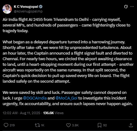 नई दिल्ली । तिरुवनंतपुरम से दिल्ली जा रहे एयर इंडिया के विमान (संख्या एआई2455) की रविवार को चेन्नई में आपातकालीन लैंडिंग कराई गई। सफर के दौरान खराब मौसम के बीच तकनीकी समस्या का शक होने पर चालक दल ने विमान को चेन्नई की तरफ मोड़ दिया, जहां विमान की सुरक्षित लैंडिंग कराई गई। विमान ने रात करीब 8 बजे तिरुवनंतपुरम से उड़ान भरी और लगभग 10.35 बजे चेन्नई पहुंचा। विमान में कांग्रेस सांसद वेणुगोपाल सहित कुछ अन्य सांसद और यात्री सवार थे, जो चालक दल की समझदारी के कारण बड़ी दुर्घटना से बाल-बाल बच गए। वेणुगोपाल ने हवाई सफर की सुरक्षा सुनिश्चित किए जाने और डीजीसीए से इस घटना की जांच की मांग की है।