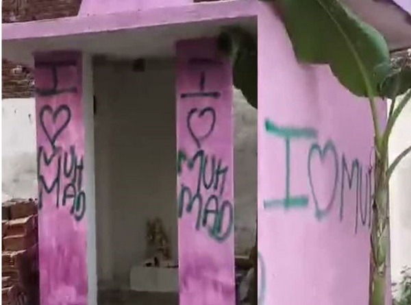 थाना लोधा इलाके के गांव बुलाकगढ़ी, भगवानपुर में शनिवार को लोग मंदिरों में पूजा पाठ करने पहुंचे तो दीवारों पर ‘आई लव मोहम्म्द’ लिखा हुआ देखकर उनके होश उड़ गए। देखते ही देखते लोगों की भीड़ एकत्र हो गई। करणी सेना के राष्ट्रीय उपाध्यक्ष ज्ञानेंद्र चौहान पदाधिकारियों और कार्यकर्ता के साथ गांव पहुंच गये।