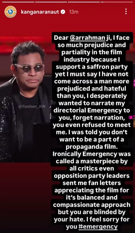 “प्रिय रहमान जी, मुझे फिल्म इंडस्ट्री में पक्षपात और भेदभाव का सामना करना पड़ा, लेकिन मैंने आपके जैसा पूर्वाग्रही और नफरत करने वाला इंसान नहीं देखा। मैंने आपको अपनी फिल्म इमरजेंसी की कहानी सुनाने की कोशिश की, लेकिन आपने मिलने से मना कर दिया। यह दुखद है कि आपने अपनी नफरत में अंधे होकर ऐसा किया।”