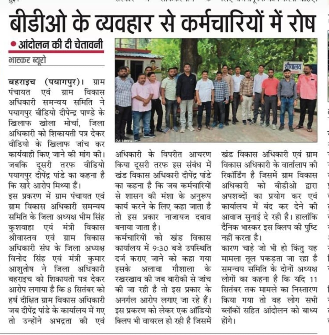 गौरतलब है कि विगत एक सप्ताह पूर्व से बीडीओ दीपेंद्र पांडे के खिलाफ ग्राम पंचायत एवं ग्राम विकास अधिकारी समन्वय समिति ने मोर्चा खोल रखा था । समन्वय समिति का कहना है कि 8 सितंबर को ग्राम विकास अधिकारी हर्ष दीक्षित छुट्टी मांगने के लिए उनके चेंबर में गए थे तो बीडियो ने उनके साथ अभद्रता की l इस प्रकरण में बीडियो ने अपनी सफाई पेश करते हुए कहा कि सरकार की मनसा के अनुसार कार्य न करने के लिए दबाव बनाया जा रहा है । यह मामला दोनों तरफ से काफी चर्चा का विषय बना और दोनों लोग अपने-अपने पक्ष में लोगों को लामबंद करने में जुट गए l पयागपुर खंड विकास अधिकारी दीपेंद्र पांडे के समर्थन में ब्लॉक प्रमुख पयागपुर गीता देवी, समय प्रसाद मिश्रा एवं तमाम प्रधान एवं विकास अधिकारी भी समर्थन में खड़े हुए ।