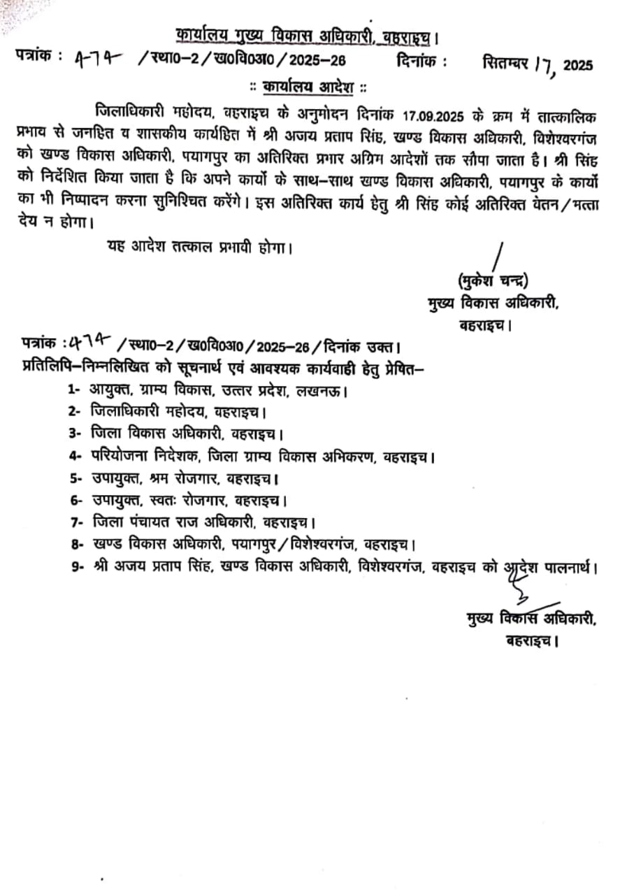Tehsil Payagpur, Bahraich : मुख्य विकास अधिकारी ने जिला अधिकारी की संस्तुति से पयागपुर के खंड विकास अधिकारी पद पर तैनात रहे दीपेंद्र पांडे को बहराइच जिला शिक्षा एवं प्रशिक्षण संस्थान चित्तौरा से संबंध कर दियागया है l जबकि विशेश्वरगंज के खंड विकास अधिकारी अजय कुमार सिंह को पयागपुर का प्रभार सौंपा गया है।