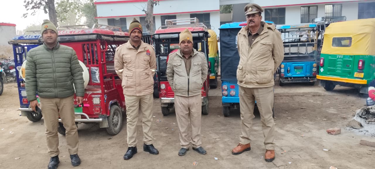 प्रभारी निरीक्षक रमेश सिंह रावत ने बताया कि यातायात नियमों का पालन सुनिश्चित कराने हेतु थाने की टीम को क्षेत्र में चेकिंग अभियान पर लगाया गया। अभियान के दौरान वरिष्ठ उपनिरीक्षक दीनानाथ सागर, उपनिरीक्षक जितेन्द्र कुमार सिंह, उपनिरीक्षक आशुतोष चन्द, हेड कांस्टेबल विनाय कुमार कनौजिया और राम प्रवेश ने कई ई-रिक्शाओं की विस्तृत जांच की।