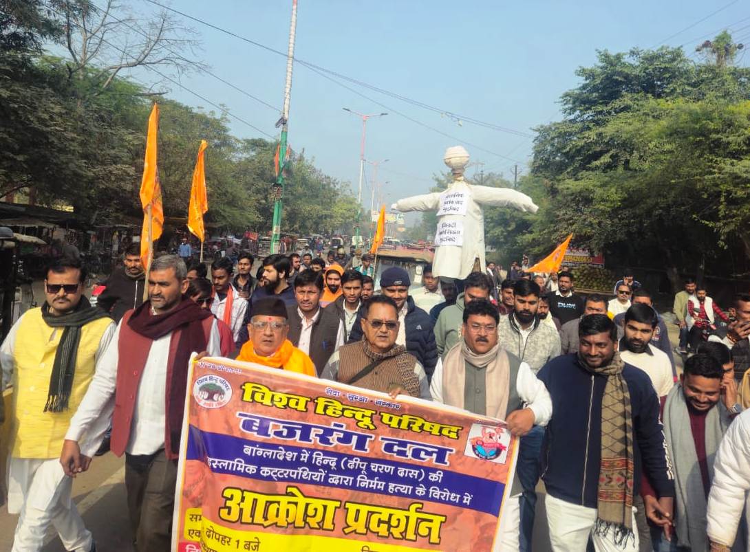 विश्व हिंदू परिषद जिलाध्यक्ष प्रकाशचंद्र त्रिपाठी की अगुवाई में बुधवार को हिंदूवादी संगठन के पदाधिकारियों और कार्यकर्ताओं ने महाराणा प्रताप चौक से स्वतंत्रता स्मारक अशोक लाट तिराहे तक पैदल मार्च करते हुए जुलूस निकाला। प्रदर्शनकारियों ने “हिंदुओं पर अत्याचार नहीं सहेंगे… नहीं सहेंगे” और “दीपू के हत्यारों को सख्त सजा दो” जैसे नारे लगाए। उन्होंने कहा कि बांग्लादेश में जब से मोहम्मद यूनुस के हाथ में सत्ता आई है, तब से योजनाबद्ध तरीके से सरकार के संरक्षण में हिंदुओं पर अत्याचार हो रहे हैं। इसे किसी भी हाल में सहन नहीं किया जाएगा।