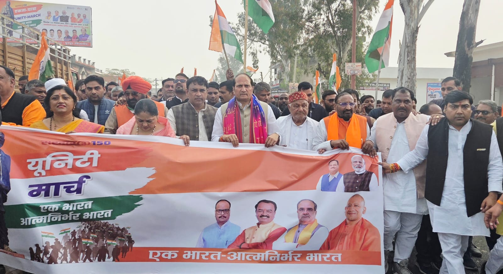 Noorpur, Bijnor : सरदार वल्लभ भाई पटेल की जयंती पर नगर में विशाल एकता यात्रा निकाली गई।भारत के पहले गृहमंत्री लौहपुरूष सरदार वल्लभ भाई पटेल की 150 वी जयंती पर नगर में विशाल एकता यात्रा निकाली गई।यात्रा मुरादाबाद रोड स्थित परफेक्ट क्लासेज से प्रारंभ होकर शिव मंदिर चौक होते हुए सरस्वती शिशु विद्या मंदिर इंटर कॉलेज में सभास्थल पर सम्पन्न हुई। सभा का शुभारंभ सरदार पटेल के चित्र पर पुष्पांजलि अर्पित कर किया गया।