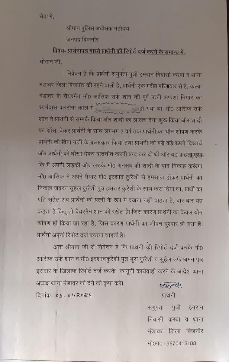 मंडावर, बिजनौर। नगर पंचायत मंडावर के चेयरमैन आसिफ उर्फ शान पर एक महिला ने शादी का झांसा देकर बलात्कार करने और उसकी मर्जी के बिना जबरन किसी और के साथ शादी कराने का आरोप लगाकर एसपी को प्रार्थना पत्र दिया हैं।