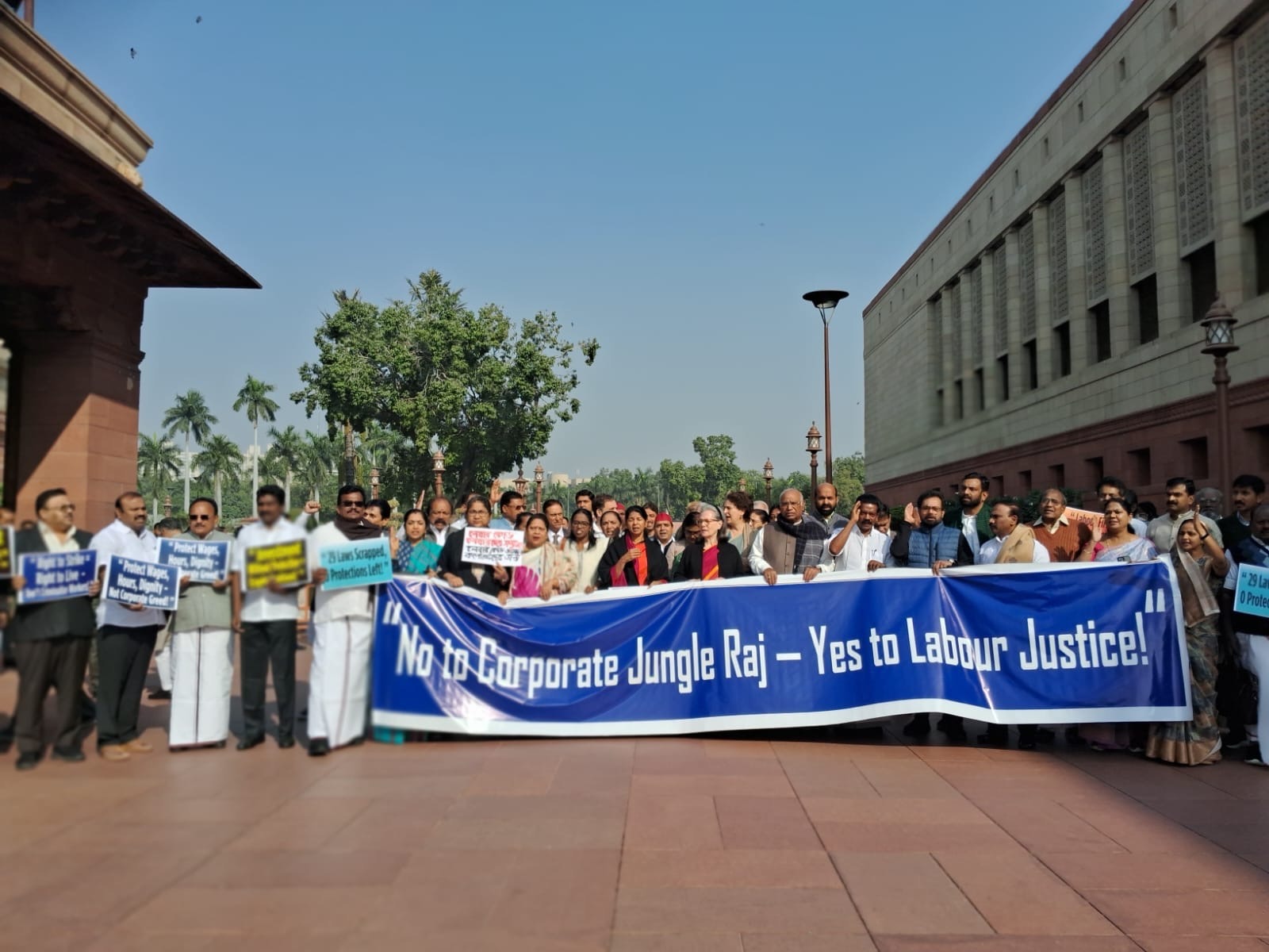 नेता कतारबद्ध होकर हाथों में पोस्टर और बैनर लिए ‘श्रमिकों के हक़ बचाओ’, ‘कॉपोरेट जंगलराज को ना कहें’, ‘श्रमिक न्याय हो’, ‘श्रमिक विरोधी कानून वापस लो’ जैसे नारे लगाते रहे। प्रदर्शनकारियों ने श्रम कानूनों को खत्म करने की मांग करते हुए संसद परिसर में जोरदार नारेबाजी की। कांग्रेस और इंडी गठबंधन नए नए श्रम कानूनों पर श्रमिकों के अधिकारों, सुरक्षा और सामाजिक सुरक्षा को कमजोर करने का आरोप लगाते हैं।