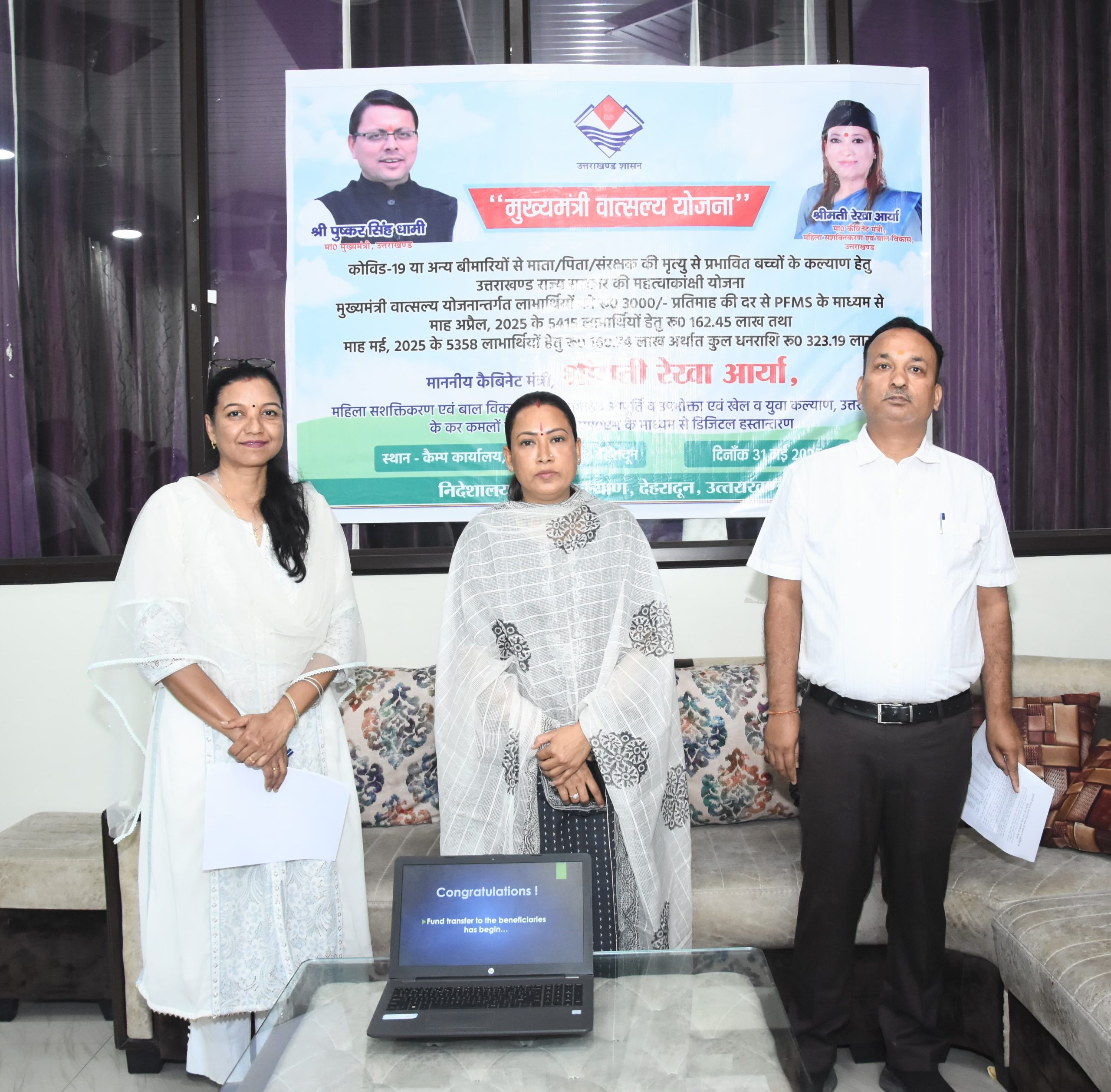 देहरादून। महिला सशक्तिकरण एवं बाल विकास मंत्री रेखा आर्या ने शनिवार को मुख्यमंत्री वात्सल्य योजना के तहत अप्रैल और मई माह के लिए कुल 3 करोड़ 23 लाख 19 हजार रुपये की धनराशि लाभार्थियों के खातों में सीधे हस्तांतरित (डीबीटी) की।