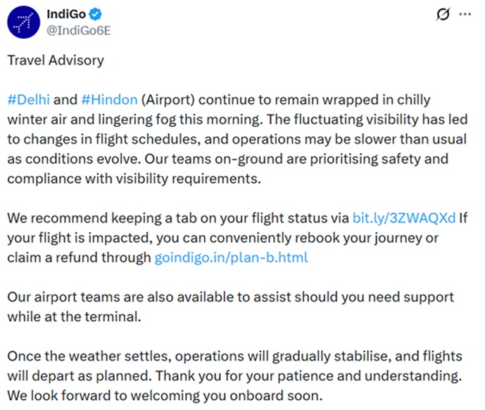 New Delhi : देश की विमान सेवा इंटर ग्लोब एविएशन लिमिटेड (इंडिगो) ने कहा कि आज सुबह दिल्ली और हिंडन के साथ-साथ जम्मू हवाई अड्डा में घना कोहरा छाया हुआ है। दृश्यता में उतार-चढ़ाव के कारण उड़ानों के निर्धारित समय( फ्लाइट शेड्यूल) में बदलाव किया गया। जैसे-जैसे मौसम साफ होगा, इसमें सुधार किया जाएगा।