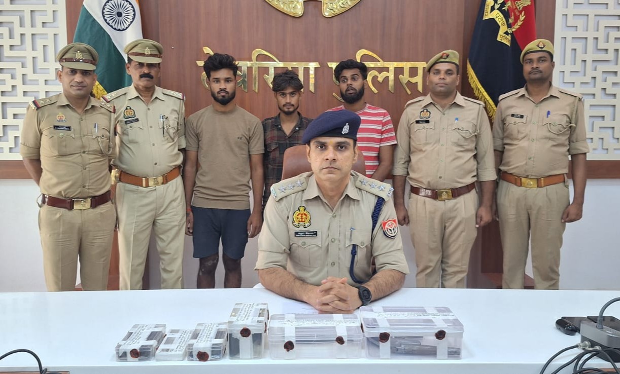 Bhatpar Rani, Deoria : श्रीरामपुर पुलिस ने मंगलवार को लूट के मामले में शामिल तीन अभियुक्तों को गिरफ्तार किया। पुलिस ने उनके पास से दो मोटरसाइकिलें, एक तमंचा, एक जिंदा कारतूस, एक चाकू, लूटी गई चेन, एक एंड्रॉइड मोबाइल और सात सौ रुपये नकद बरामद किए।