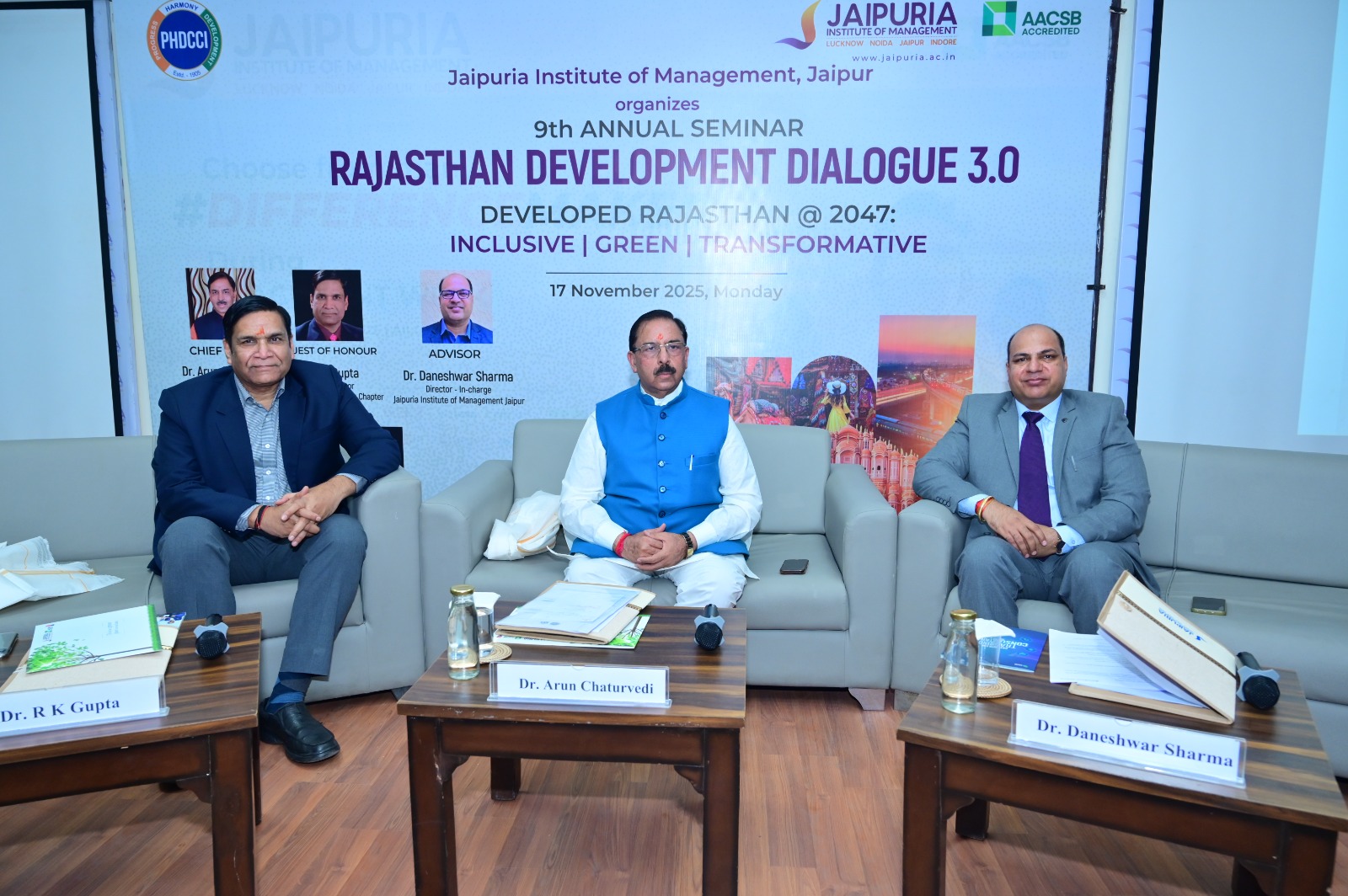 जयपुर। “आत्मनिर्भरता ही भारत के विकास की कुंजी है,” यह विचार राजस्थान सरकार के राज्य वित्त आयोग के अध्यक्ष डॉ. अरुण चतुर्वेदी ने राजस्थान विकास संवाद 3.0 2025 में व्यक्त किया। जयपुरिया इंस्टीट्यूट ऑफ मैनेजमेंट, जयपुर द्वारा पीएचडीसीसीआई (PHDCCI) के सहयोग से “समावेशी, हरित, परिवर्तनकारी” विषय पर 9वां राजस्थान विकास संवाद संगोष्ठी का आयोजन किया गया, जिसमें कई प्रतिष्ठित गणमान्य अतिथियों और विशेषज्ञों ने भाग लिया।