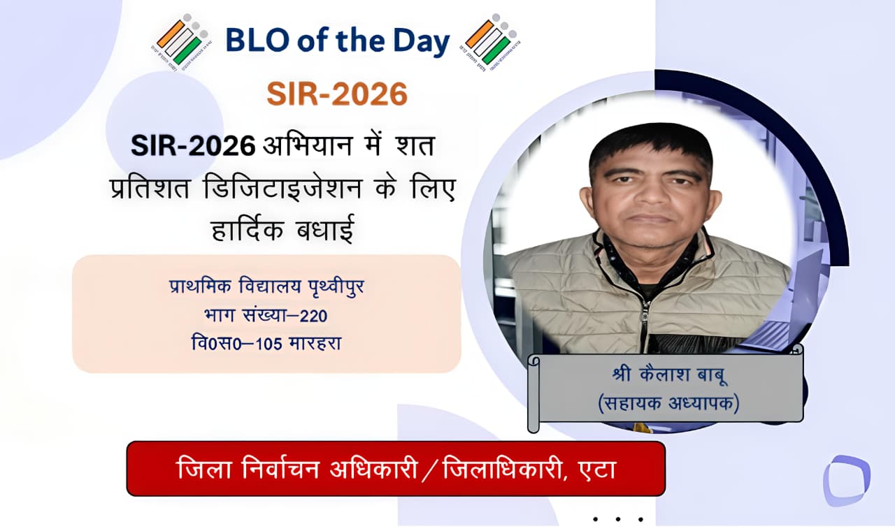 Etah : विशेष प्रगाढ़ पुनरीक्षण प्रशिक्षण 2026 (SIR) के तहत जिले में मतदाता सूची से जुड़े कार्यों में पारदर्शिता के तहत जिला प्रशासन को जिले में एक महत्वपूर्ण सफलता मिली है। जिला निर्वाचन अधिकारी/जिलाधिकारी प्रेमरंजन सिंह के मार्गदर्शन में भाग संख्या 220, विधानसभा 105 मरहरा के बीएलओ कैलाश बाबू सहायक अध्यापक ने मतगणना प्रपत्रों का शत-प्रतिशत डिजिटाइजेशन का कार्य समय पर और उच्च गुणवत्ता के साथ पूर्ण कर दिया।
