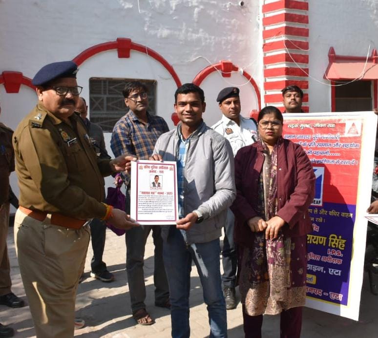 एटा। उत्तर प्रदेश शासन एवं यातायात निदेशालय, लखनऊ द्वारा संचालित नवंबर माह के राज्यव्यापी सड़क सुरक्षा एवं जन-जागरूकता अभियान के अंतर्गत, आज एटा में “बधिर चालकों के लिए कान के प्रतीक चिन्ह” लगाने हेतु विशेष अभियान का शुभारंभ किया गया। इस कार्यक्रम के तहत, एसएसपी श्याम नारायण सिंह एवं एएसपी श्वेताभ पाण्डेय ने बधिर चालकों की बाइक व हेलमेट पर कान के चिह्न लगाए, साथ ही उन्हें प्रशस्ति पत्र भी प्रदान किए गए।