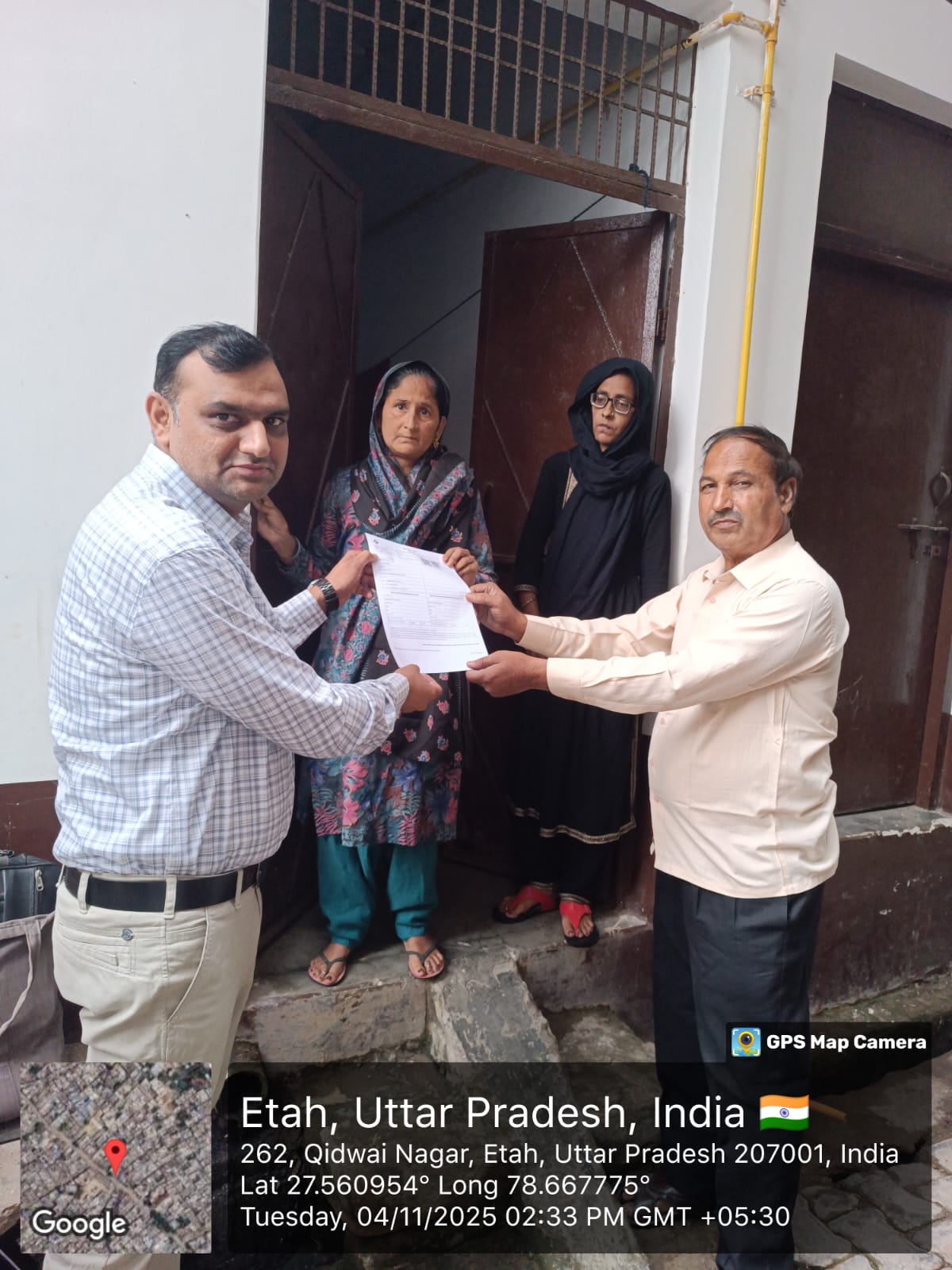 103-अलीगंज विधानसभा में निर्वाचन पंजीकरण अधिकारी जगमोहन गुप्ता द्वारा मतदाताओं को गणना प्रपत्र उपलब्ध कराए गए। सहायक अधिकारियों द्वारा क्षेत्र में घर-घर जाकर मतदाताओं के विवरण संकलित किए जा रहे हैं।104-एटा सदर विधानसभा में तहसीलदार नीरज वार्ष्णेय द्वारा मतदाताओं को गणना प्रपत्र प्रदान किए गए और मतदाता सूची के शुद्धिकरण हेतु आवश्यक दिशा-निर्देश दिए गए।