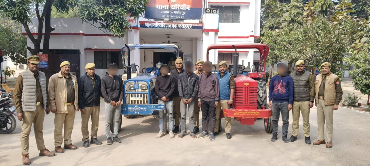 फतेहपुर । इंटेलिजेंस विंग, एसओजी व थरियांव पुलिस की संयुक्त टीम ने बड़ी सफलता हासिल करते हुए शातिर वाहन चोर गिरोह के पांच सक्रिय सदस्यों को गिरफ्तार किया है। कार्रवाई के दौरान आरोपियों की निशानदेही पर चोरी के दो ट्रैक्टर, एक ट्राली और पांच एंड्रॉयड मोबाइल फोन बरामद किए गए हैं, जबकि गिरोह के दो अन्य सदस्य मौके से फरार हो गए।