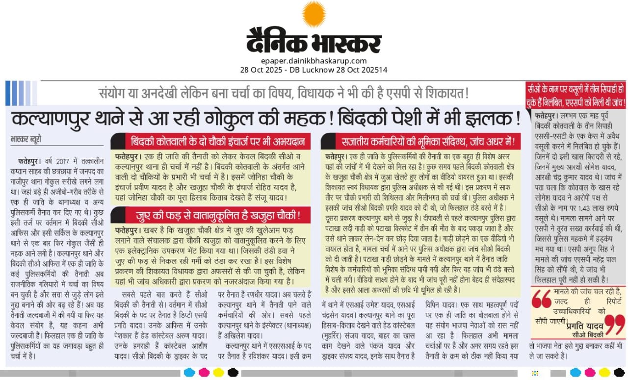 Fatehpur : बिंदकी सीओ पेशी और कल्यानपुर थाने में महत्वपूर्ण पदों पर एक ही बिरादरी के पुलिसकर्मियों की तैनाती को लेकर आपके अपने अखबार दैनिक भास्कर ने जो खबर प्रकाशित की थी, उसका असर देखने को मिला है। पुलिस अधीक्षक ने खबर को संज्ञान में लेते ही बिंदकी कोतवाली के दो चौकी इंचार्ज समेत कल्यानपुर थाने में जमा इन चर्चित कर्मचारियों को स्थानांतरित व पुलिस लाइन का रास्ता दिखाया है। इतना ही नहीं दूसरे थानों में पुलिसिंग छोड़कर अन्य काम करने वाले पुलिसकर्मियों को पुलिस लाइन भेजा गया है। ताबड़तोड़ कार्यवाही से महकमे में हड़कम्प की स्थिति है।