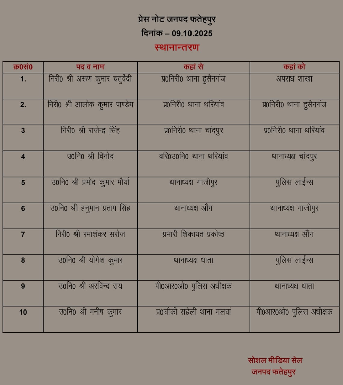 एसपी ने अरुण कुमार चतुर्वेदी को अपराध शाखा में भेजा और योगेश कुमार व प्रमोद कुमार मौर्या को लाइन हाजिर किया है। तैनाती के क्रम में इंस्पेक्टर थरियांव आलोक कुमार पांडेय को इंस्पेक्टर हुसैनगंज, इंस्पेक्टर चांदपुर राजेंद्र सिंह को थरियांव, एसएसआई थरियांव उप निरीक्षक विनोद को थानाध्यक्ष चांदपुर, थानाध्यक्ष औंग हनुमान प्रताप सिंह को थानाध्यक्ष गाजीपुर, प्रभारी शिकायत प्रकोष्ठ रमाशंकर सरोज को एसओ औंग, पीआरओ पुलिस अधीक्षक अरविंद राय को थानाध्यक्ष धाता और चौकी प्रभारी सहिली थाना मलवां मनीष कुमार को पीआरओ पुलिस अधीक्षक के पद पर भेजा गया है। हालांकि विभागीय सूचनाओं के क्रम में मलवां इंस्पेक्टर राजकिशोर जो पूर्व में अपनी गैर जिम्मेदार कार्यशैली की वजह से प्रतापगढ़ से जेल तक जा चुके हैं उनको लेकर पुलिस अधीक्षक ने अभी चुप्पी साध रखी है।