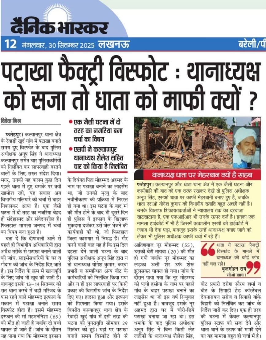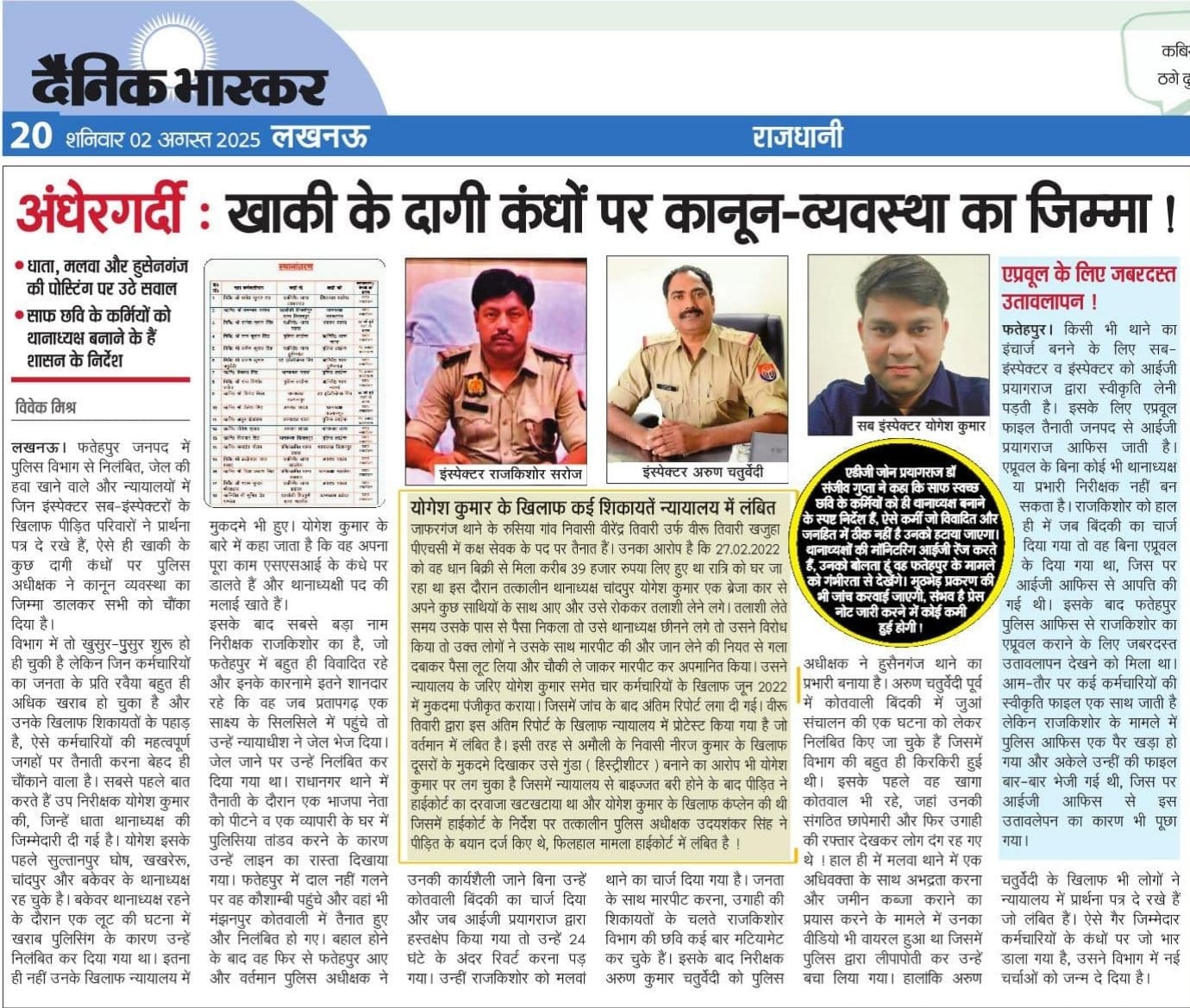 बता दें कि आपके अपने दैनिक भास्कर अखबार ने थानों में भ्रष्ट व बेहद ही लापरवाह और दागी थानेदारों की पोस्टिंग करने को लेकर प्रमुखता से खबरें प्रकाशित की थी। पुलिस अधीक्षक द्वारा तत्काल इस पर विचार नहीं करने पर इस मामले को भाजपा के जनपद के शीर्ष नेताओं ने संज्ञान में लिया और इसकी शिकायत शासन तक की और बताया कि बेहद ही खराब छवि के पुलिसकर्मियों को किस तरह से थानेदार बनाकर जनता का शोषण किया जा रहा है ! प्रकरण में गुरूवार की रात पुलिस अधीक्षक अनूप सिंह ने हुसैनगंज इंस्पेक्टर अरुण कुमार चतुर्वेदी जो इस समय एक हादसे में घायल होने के बाद इलाज के लिए गए हुए है उन्हें, धाता थानाध्यक्ष योगेश कुमार और गाजीपुर थानाध्यक्ष प्रमोद कुमार मौर्य को पैदल कर दिया।