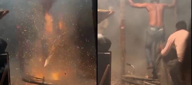 जैसे ही पटाखे जलते हैं, पूरे शरीर पर धमाकों और रोशनी का दृश्य बन जाता है। धमाकों की आवाज इतनी तेज़ होती है कि आसपास के लोग भी दहशत में आ जाते हैं। धुएँ और लपटों के बीच, उस युवक की हालत देखकर हर किसी का दिल घबराने लगता है। कुछ सेकंड बाद, आग बुझने लगती है और आसपास खड़े लोग उसकी जली हुई त्वचा को देखकर घबराकर कपड़ा लेकर दौड़ते हैं, ताकि जले हुए हिस्सों को संभाला जा सके।