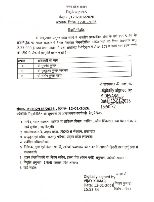 Lucknow : उत्तर प्रदेश सरकार ने बड़े प्रशासनिक फेरबदल में संजय प्रसाद, आशीष गोयल सहित वरिष्ठ IAS अधिकारियों को अपर मुख्य सचिव/प्रमुख सचिव के रूप में तैनात किया है।