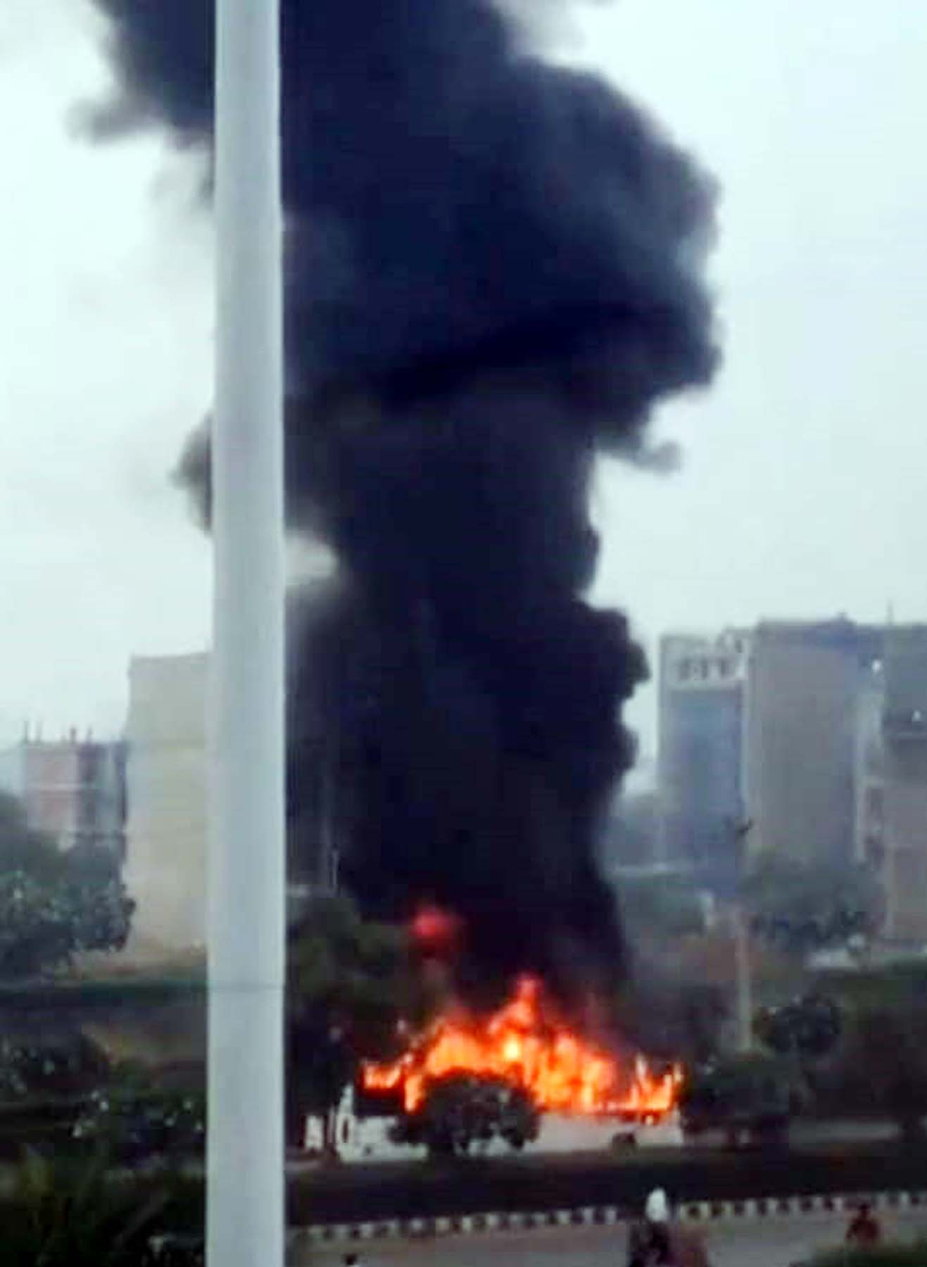 गुरुग्राम : यहां एक चलती बस आग का गोला बन गई। एक कंपनी के स्टाफ को लेकर जा रही बस में भीषण आग लग गई। गोल्फ कोर्स रोड पर हुई इस घटना के दौरान लंबा जाम भी लग गया। गुरुवार को लगी इस आग को लेकर दमकल विभाग से फायर अधिकारी जय नारायण ने बताया कि बस में लगी आग आधे घंटे में बुझा दी गई थी।