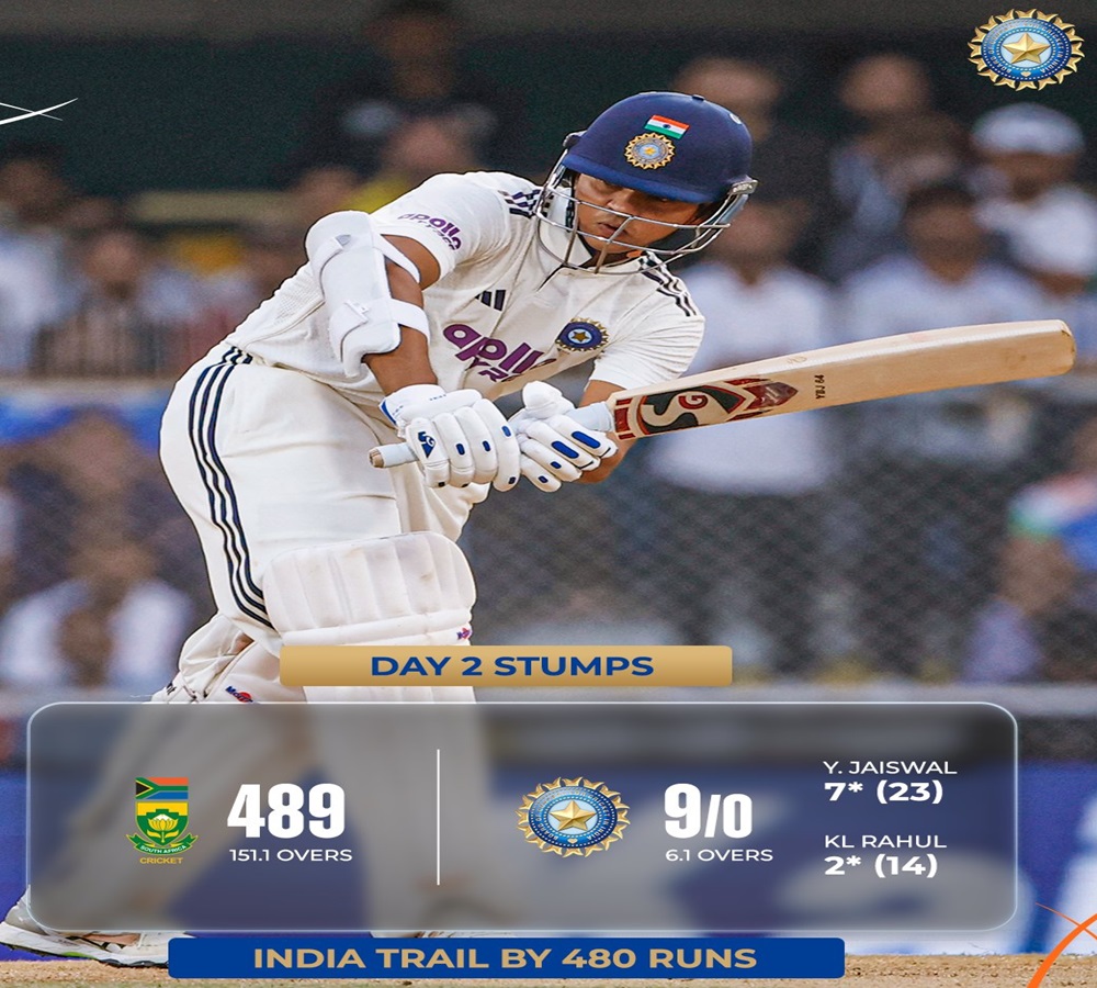 इसके जवाब में दिन के खेल की समाप्ति तक भारतीय टीम ने पहली पारी में बिना कोई विकेट गवाए 9 रन बना लिए हैं और वह दक्षिण अफ्रीका से 480 रन पीछे है। यशस्वी जायसवाल सात और केएल राहुल दो रन बनाकर नाबाद हैं।