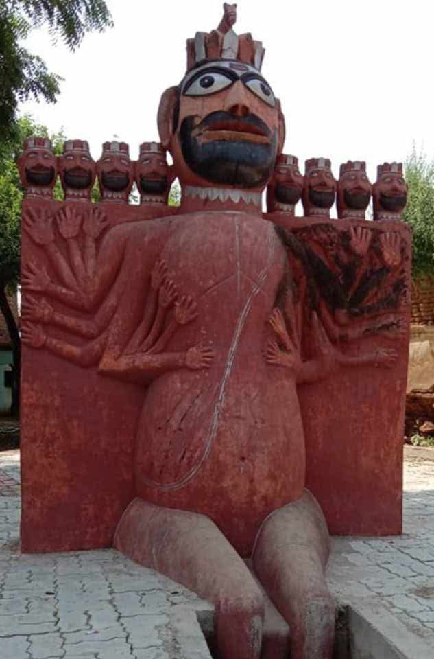 - रावण की नौ सिर और बीस भुजाओं वाली पत्थर की प्रतिमा के आगे झुकते हैं लोग