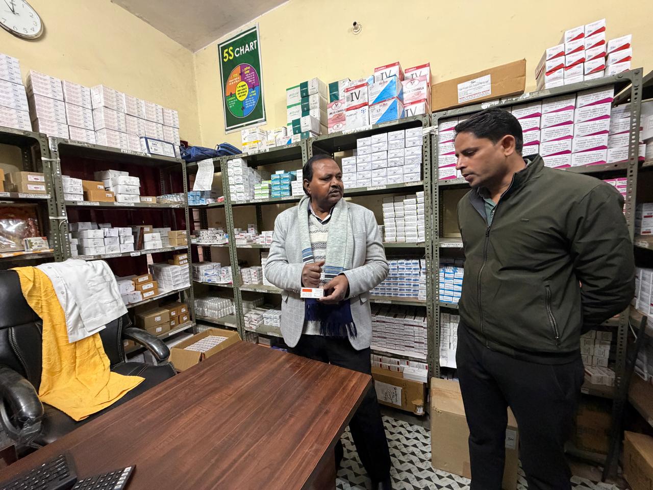 औषधि कक्ष के निरीक्षण में फार्मासिस्ट श्री चंद्रभान, श्री अशोक कुमार एवं श्री अनिल सारस्वत उपस्थित मिले। केंद्र पर ईडीएल के अनुसार 230 प्रकार की दवाएं उपलब्ध पाई गईं। सभी फार्मासिस्टों को आवश्यक दवाएं पर्याप्त मात्रा में रखने एवं दवा पैकेट पर चिकित्सकीय इकाई की मोहर अंकित करने के निर्देश दिए गए।