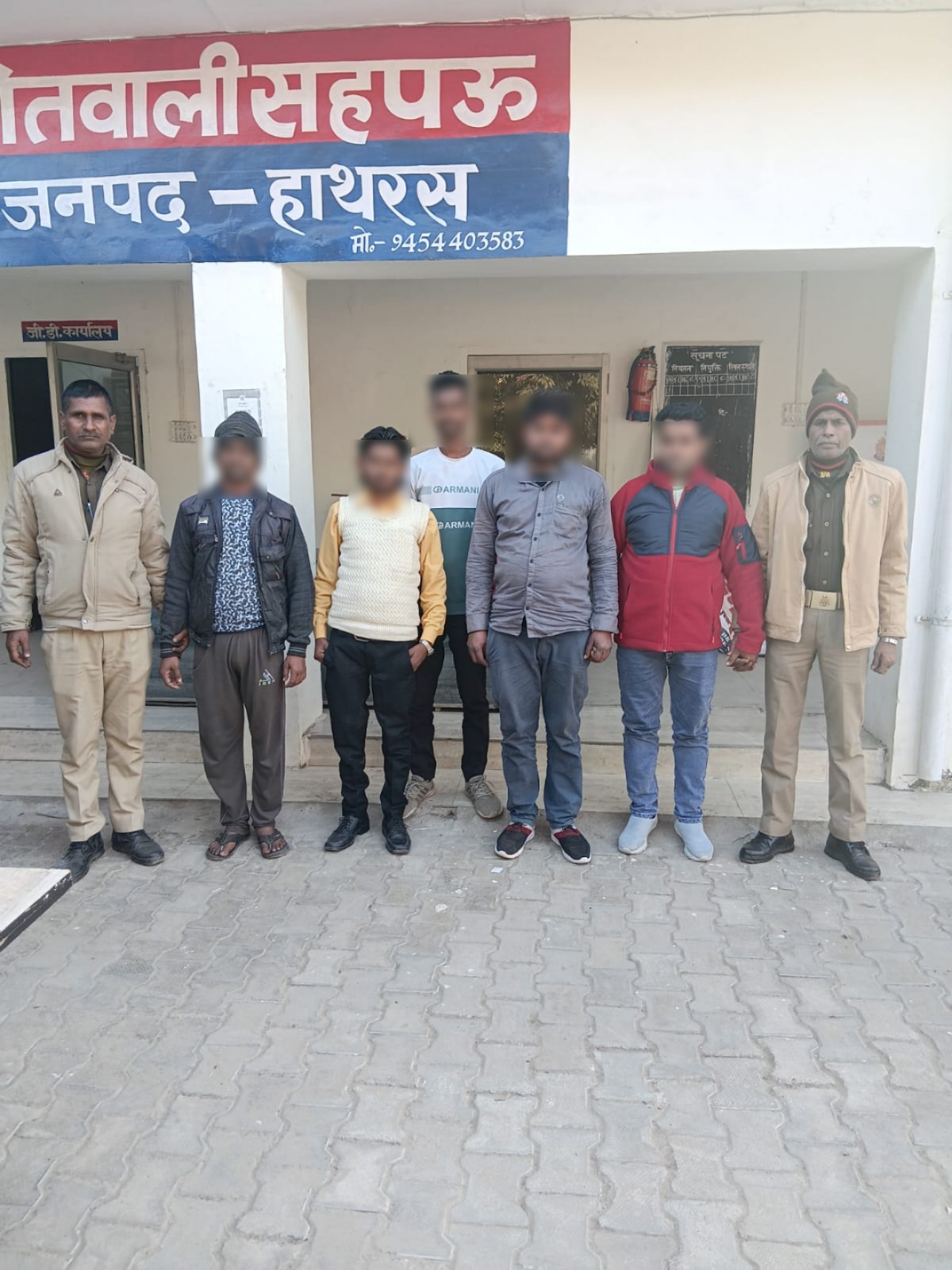 जिनके नाम मोहन पुत्र केवल सिंह निवासी मोहल्ला होली गेट, कस्बा थाना सहपऊ; सत्य प्रकाश पुत्र प्रेम सिंह निवासी मोहल्ला होली गेट, कस्बा व थाना सहपऊ; दिनेश पुत्र हरीओम निवासी मोहल्ला होली गेट, कस्बा व थाना सहपऊ; सुमन पुत्र प्रताप सिंह निवासी मोहल्ला होली गेट, कस्बा व थाना सहपऊ; और संतोष पुत्र सुभाष चंद्र निवासी मोहल्ला शुक्लयाना, कस्बा व थाना सहपऊ, जनपद हाथरस हैं।