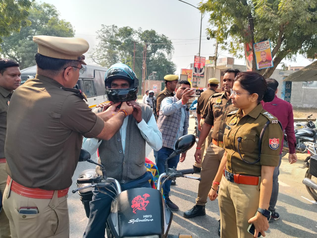 सीओ प्रतिमा वर्मा और थाना प्रभारी जयप्रकाश यादव ने यातायात अभियान के दौरान 60 हेलमेट महिलाओं एवं वरिष्ठ नागरिकों में वितरित किए। उन्होंने हेलमेट पहने मिले बाइक सवारों का सम्मान किया और उन्हें माला पहनाकर उनका उत्साहवर्धन किया।पुलिस अधिकारियों ने हेलमेट के उपयोग को जीवन रक्षा का अनिवार्य उपाय बताते हुए लोगों को यातायात नियमों के पालन के लिए प्रेरित किया। साथ ही अभियान के तहत दो हज़ार वाहनों पर रिफ्लेक्टर टेप लगाए गए।सीओ प्रतिमा वर्मा ने अपील करते हुए कहा कि यातायात नियमों का पालन करना हमारी जिम्मेदारी है। कृपया नशे में ड्राइविंग न करें, हेलमेट पहनें, सीट बेल्ट लगाएं और मोबाइल फोन का उपयोग करने से बचें। इन छोटी-छोटी बातों का ध्यान रखकर हम अपनी और दूसरों की जान बचा सकते हैं।थाना प्रभारी जयप्रकाश यादव ने कहा कि हमारा उद्देश्य है कि लोगों को यातायात नियमों के प्रति जागरूक करना और उन्हें सुरक्षित रखना। हम हेलमेट और रिफ्लेक्टर के उपयोग को बढ़ावा देने के लिए प्रतिबद्ध हैं।स्थानीय नागरिकों ने मुंगराबादशाहपुर पुलिस की इन पहलों को सड़क सुरक्षा के लिए बेहद प्रभावी बताया और इसकी सराहना की।इस अवसर पर सीओ प्रतिमा वर्मा, प्रभारी निरीक्षक जय प्रकाश यादव, उपनिरीक्षक महेश राव, उपनिरीक्षक सुनील यादव, उपनिरीक्षक सुरेन्द्र तिवारी,हेड कांस्टेबल रामचंद्र सिंह,हेड कांस्टेबल वीरेंद्र सिंह,हेड कांस्टेबल धर्मेन्द्र, कांस्टेबल दिनेश सोनकर, कांस्टेबल संदीप यादव, कांस्टेबल अमित यादव महिला आरक्षी सोनम सिंह व कांस्टेबल जितेंद्र यादव आदि लोग मौजूद रहे।