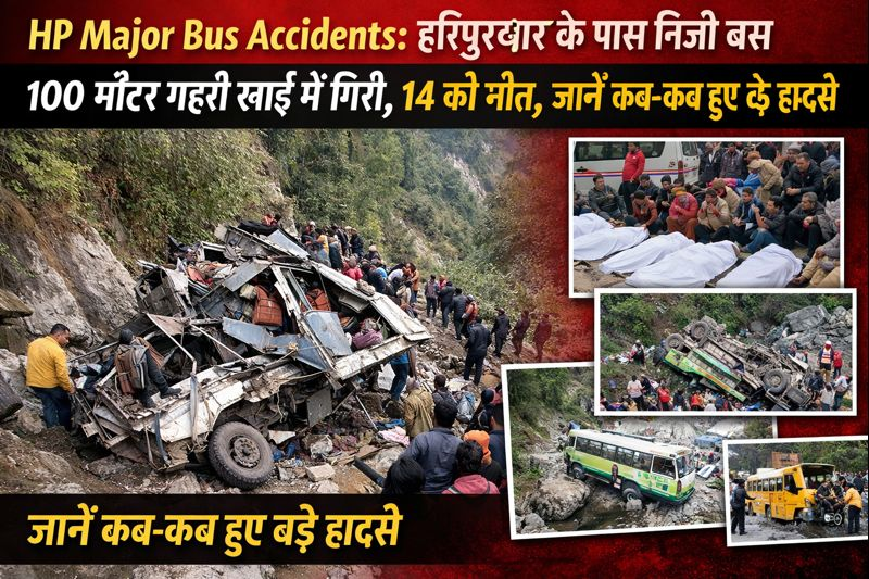 HP Major Bus Accidents: हिमाचल प्रदेश के सिरमौर जिले में शुक्रवार दोपहर एक भीषण सड़क हादसे ने पूरे राज्य को झकझोर कर रख दिया। हरिपुरधार के पास शिमला से कुपवी जा रही एक ओवरलोड निजी बस अनियंत्रित होकर करीब 100 मीटर गहरी खाई में जा गिरी। इस दर्दनाक हादसे में चालक समेत 14 लोगों की मौके पर ही मौत हो गई, जबकि 52 यात्री घायल हो गए। घायलों में कई की हालत गंभीर बताई जा रही है।
