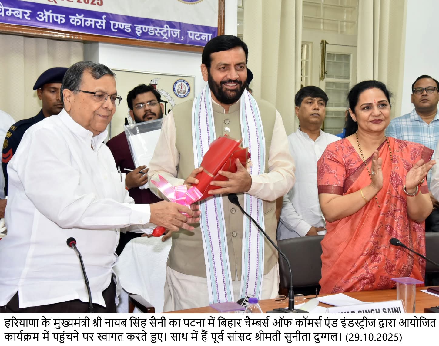 मुख्यमंत्री ने कहा कि बिहार में चमड़ा उद्योग, कपड़ा उद्योग सहित अन्य उद्योगों के प्रोत्साहन के लिए नई नीति बनाई गई है। आगामी समय में बिहार की अर्थव्यवस्था में न केवल गुणात्मक सुधार होगा बल्कि युवाओं को रोजगार के बेहतर अवसर भी उपलब्ध होंगे। इस मौके पर बिहार चैम्बर्स ऑफ कॉमर्स एंड इंडस्ट्री द्वारा मुख्यमंत्री श्री नायब सिंह सैनी का गर्मजोशी से स्वागत किया गया।