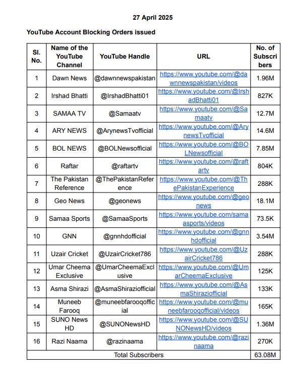गृह मंत्रालय की सिफारिशों पर सरकार ने भारत, उसकी सेना और सुरक्षा एजेंसियों के खिलाफ भड़काऊ झूठे, भ्रामक बयान और गलत सूचना प्रसारित करने के लिए ये फैसला लिया है। डॉन न्यूज, समा टीवी, जियो न्यूज सहित 16 पाकिस्तानी यूट्यूब चैनलों पर प्रतिबंध लगा दिया गया है।