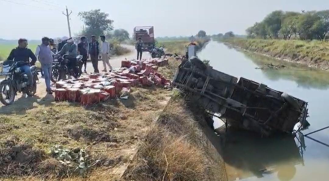 Jalaun : घने कोहरे में सरसों के तेल से लदी पिकअप नहर में गिरी