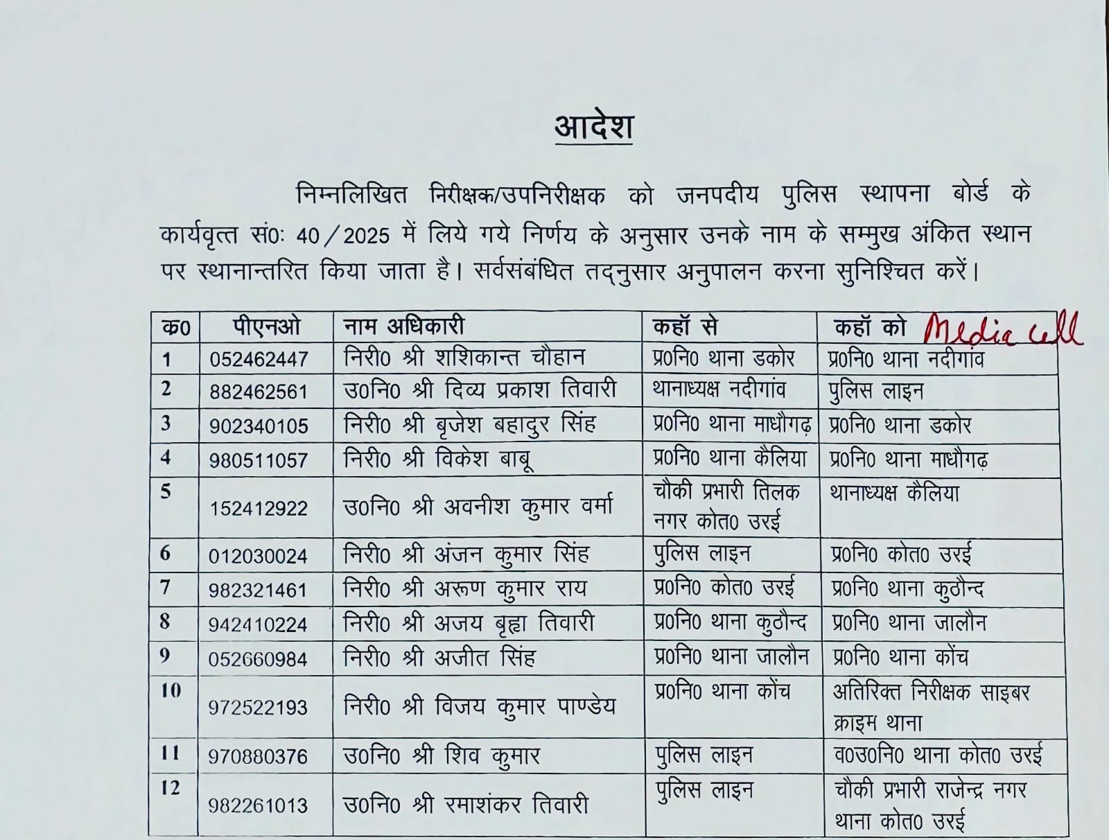 प्राप्त जानकारी के अनुसार थाना डकोर के प्रभारी निरीक्षक शशिकांत चौहान को स्थानांतरित कर थाना नदीगांव का प्रभारी बनाया गया है। वहीं नदीगांव के थानाध्यक्ष उपनिरीक्षक दिव्य प्रकाश तिवारी को पुलिस लाइन भेजा गया है। इसके अलावा थाना माधौगढ़ के प्रभारी निरीक्षक बृजेश बहादुर सिंह को डकोर, कैलिया के प्रभारी निरीक्षक विकेश बाबू को माधौगढ़ और चौकी प्रभारी तिलक नगर कोतवाली उरई के उपनिरीक्षक अवनीश कुमार वर्मा को थानाध्यक्ष कैलिया बनाया गया है।