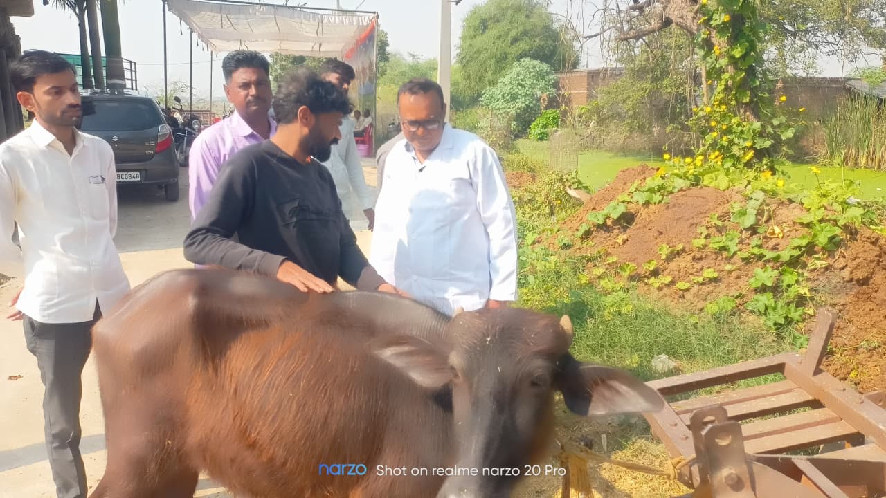 शिविर में पहुंचे डॉ. भरत सक्सेना ने गांव में बीमार पशुओं का चिकित्सीय परीक्षण किया और किसानों को मुफ्त दवाएं उपलब्ध कराईं।