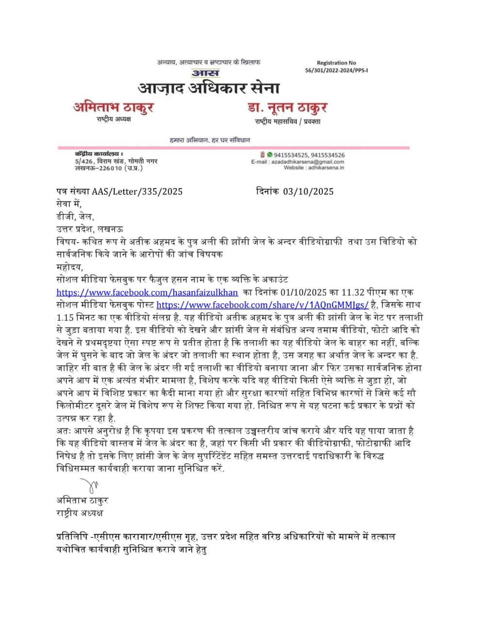 Jhansi : माफिया अतीक अहमद के बेटे अली अहमद के वायरल वीडियो को लेकर सवाल खड़े हो गए हैं। इस मामले में आजाद अधिकार सेना के राष्ट्रीय अध्यक्ष अमिताभ ठाकुर ने शुक्रवार को डीजी, जेल, यूपी को पत्र भेजकर अतीक अहमद के बेटे अली के झांसी जेल की तलाशी के कथित वीडियो के मामले की जांच और समुचित कार्रवाई की मांग की है। वायरल वीडियो में तलाशी स्थल पर अली अहमद खड़ा दिखाई दे रहा है और उसकी वीडियो रिकॉर्ड की जा रही है।
