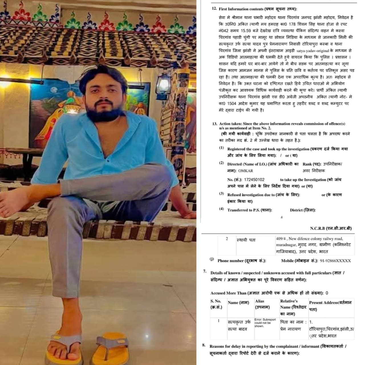 शिकायत के अनुसार, उपनिरीक्षक अंकित त्यागी हमराह आरक्षी शिवम सिंह के साथ बुधवार को रात्रि व्यवस्था एवं संदिग्ध वाहनों की चेकिंग के लिए चिरगांव कस्बे की पहाड़ी चुंगी पर मौजूद थे। इस दौरान सोशल मीडिया के माध्यम से जानकारी मिली कि सत्यवृत उर्फ सत्या यादव पुत्र प्रेमनारायण निवासी टोरियापुरा, कस्बा एवं थाना चिरगांव ने अपनी इंस्टाग्राम आईडी से एक वीडियो पोस्ट किया है, जिसमें उसने कहा कि “यदि पुलिस या प्रशासन बार-बार मेरे घर आएगा, तो मैं बीच सड़क पर आत्महत्या कर लूंगा।”