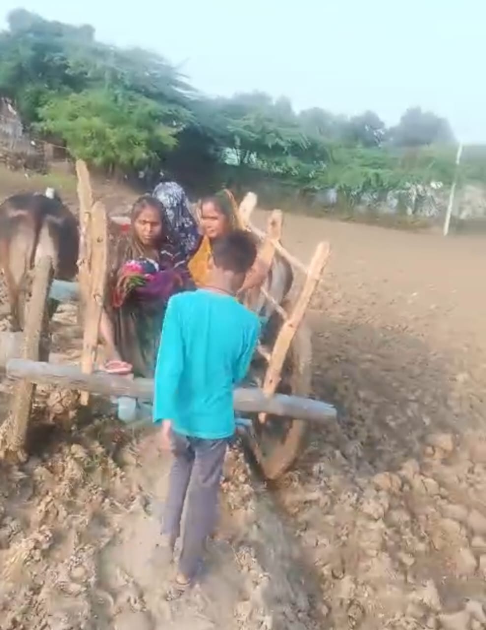 जानकारी के अनुसार, सोमवती पत्नी चंद्रभान को सोमवार को प्रसव पीड़ा हुई। परिजनों ने जब उसे अस्पताल ले जाने की कोशिश की, तो सड़क न होने के कारण एंबुलेंस गांव तक नहीं पहुंच सकी। मजबूरी में परिजनों ने बैलगाड़ी का सहारा लिया और उसे खेतों व कीचड़ भरे रास्तों से होते हुए लगभग तीन किलोमीटर दूर कटेरा रोड तक पहुंचाया, जहां से आगे वाहन की व्यवस्था की गई।