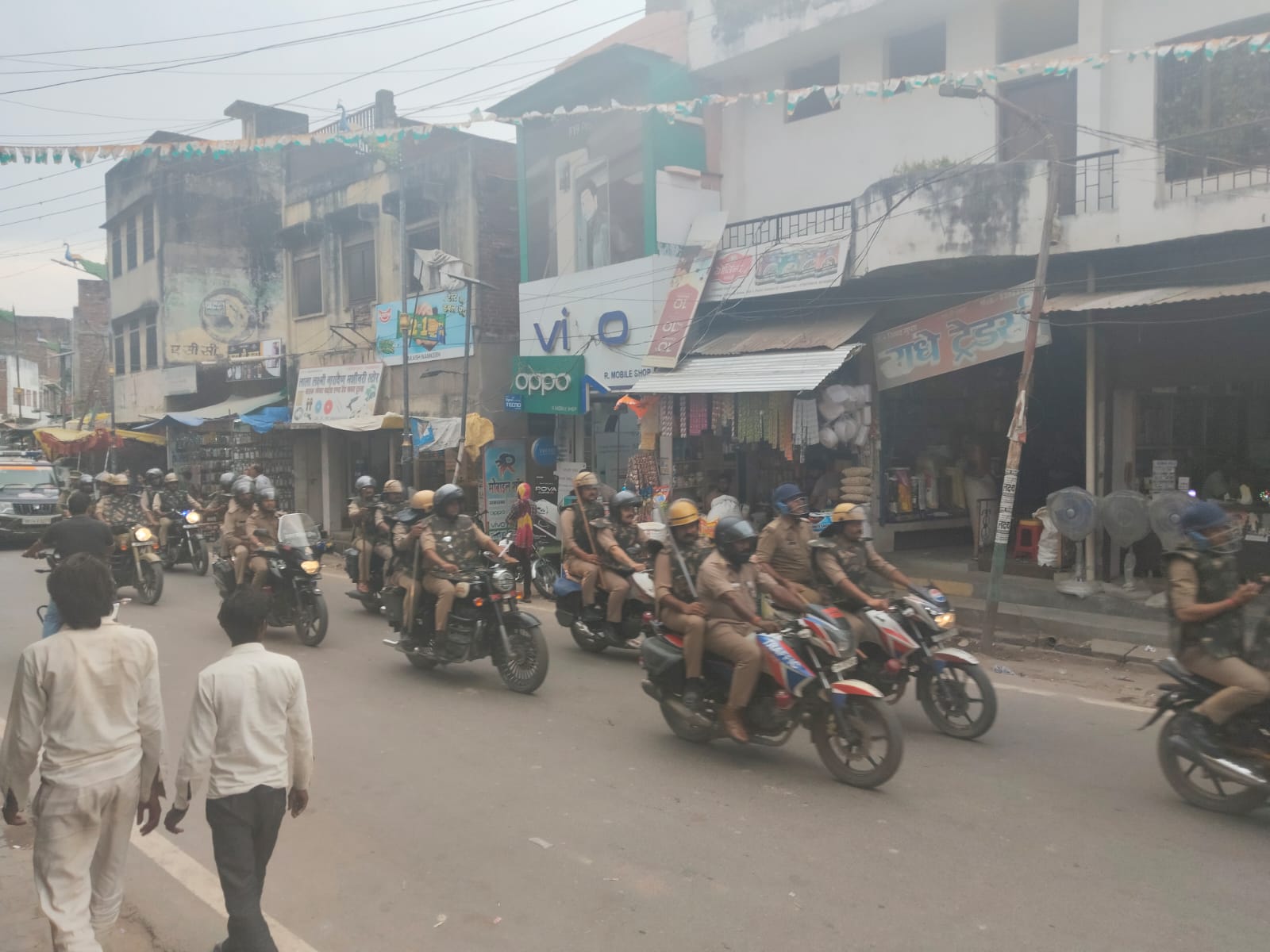 बॉडी प्रोटेक्ट, हेलमेट पहने और अत्याधुनिक शस्त्रों से लैस पुलिसकर्मी दोपहिया और चारपहिया वाहनों पर सवार होकर कोतवाली से फ्लैग मार्च शुरू किया। जीटी रोड, तिर्वा रोड, गांधीनगर आदि इलाकों में फ्लैग मार्च किया गया।