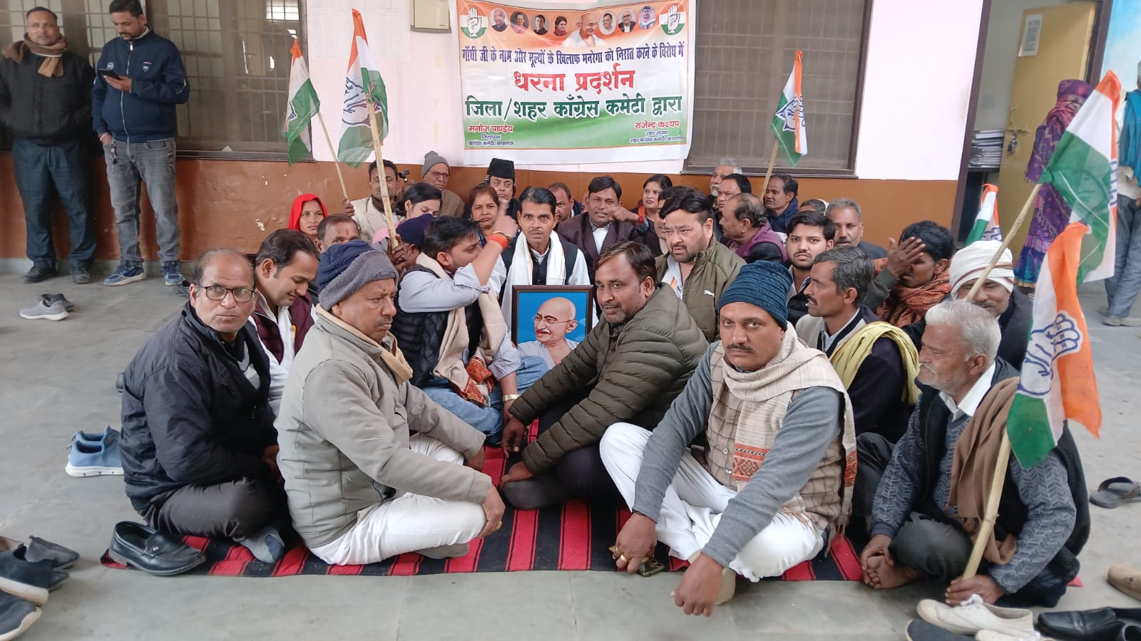 आपको बता दें कि महात्मा गांधी राष्ट्रीय ग्रामीण रोजगार गारंटी योजना (मनरेगा) का नाम बदलने के विरोध में कांग्रेस लगातार केंद्र की मोदी सरकार पर निशाना साध रही है, इसी के चलते प्रदेश स्तरीय निर्देश पर जनपद कासगंज के कांग्रेस पार्टी के जिलाध्यक्ष मनोज पांडे के नेतृत्व में दर्जनों पदाधिकारी कासगंज तहसील पहुंचे, जहां उन्होंने तहसील परिसर में महात्मा गाँधी के चित्र को रखकर उनके समक्ष धरना प्रदर्शन किया, और उन्होंने केंद्र सरकार के खिलाफ जमकर नारेबाजी भी की।