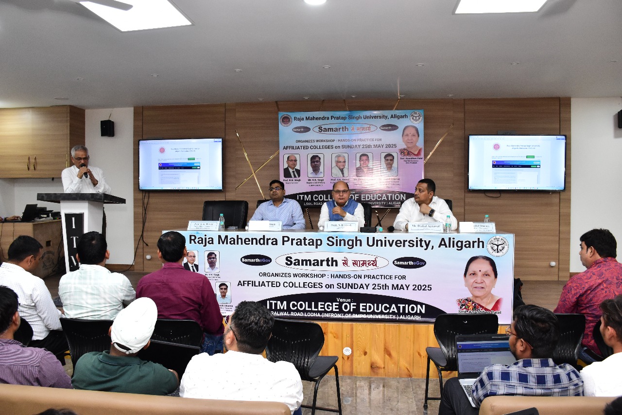 कासगंज। राजा महेंद्र प्रताप सिंह विश्वविद्यालय अलीगढ़ के नवीन शैक्षणिक सत्र 2025-26 हेतु प्रवेश वेब रजिस्ट्रेशन समर्थ पोर्टल के माध्यम से किए जाएंगे। जिसके क्रियान्वयन हेतु रविवार को आईटीएम कॉलेज ऑफ एजुकेशन लोधा में आयोजित की गई कार्यशाला में मंडल के चारों जनपदों के करीब 300 से अधिक प्राचार्यों एवं कंप्यूटर ऑपरेटर्स द्वारा प्रतिभाग किया गया। उक्त कार्यशाला में संबद्ध संस्थानों को समर्थ डिजिटल पोर्टल के प्रभावी उपयोग हेतु प्रशिक्षण प्रदान किया गया। जिससे प्रशासनिक प्रक्रिया अधिक पारदर्शी, दक्ष और उन्नत बनाई जा सके।