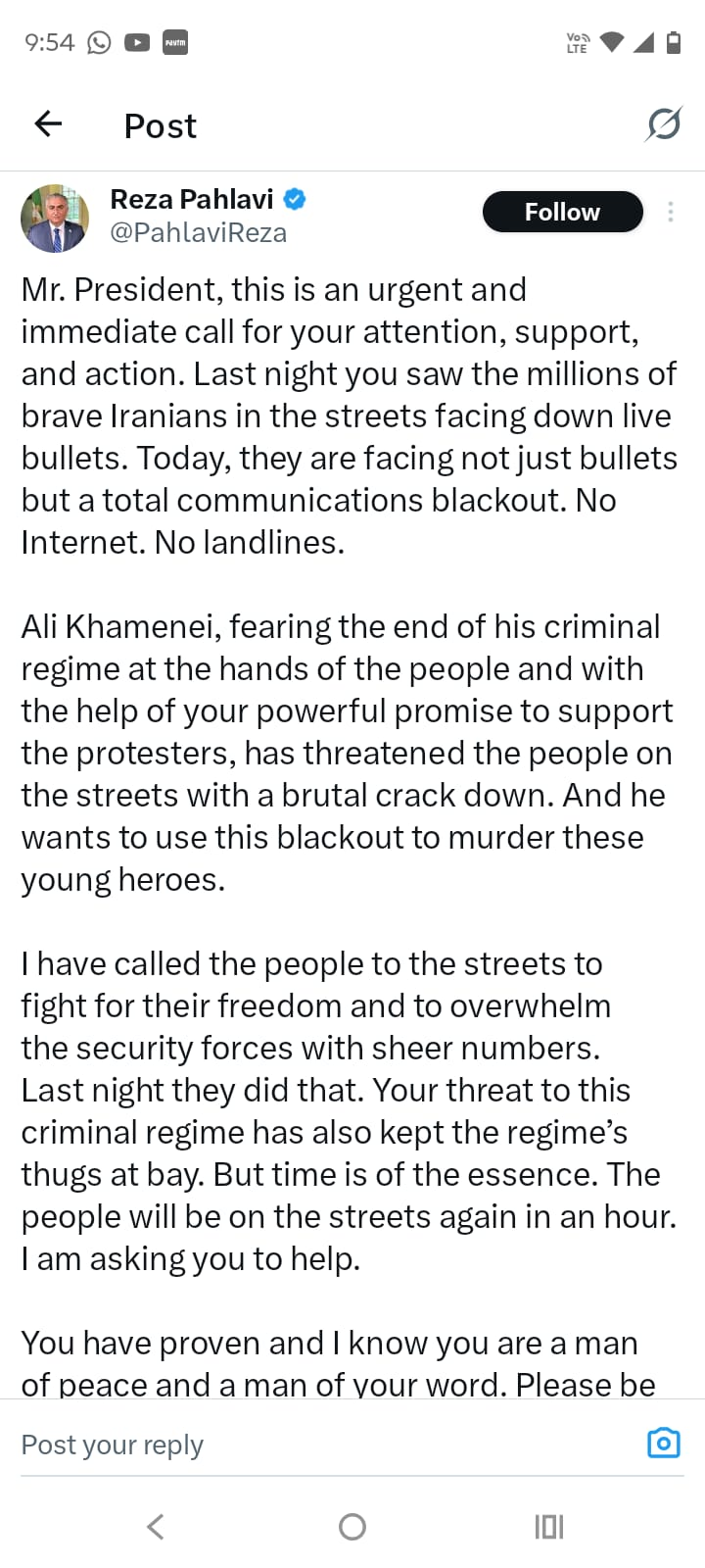 उन्होंने मोहम्मद रजा पहलवी का उल्लेख करते हुए कहा कि उन जैसे अहंकारी शासकों ने भी अपने घमंड की चरम सीमा पर पहुंच कर पतन देखा था और ट्रंप का भी यही हश्र होगा। उधर, ईरान के पूर्व शाह के निर्वासित बेटे रजा पहलवी ने अमेरिकी राष्ट्रपति से ईरान में दखल देने के लिए तैयार रहने की अपील की है। ईरान में अराजकता के बीच ट्रंप ने कहा है कि वहां के हालात पर करीब से नजर रखी जा रही है।