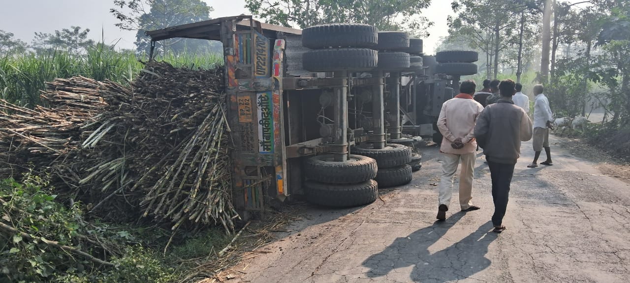 Lakhimpur Kheri : लखीमपुर खीरी के ईसानगर के समर्दा हरि के पास गुरुवार गोविंद शुगर मिल का गन्ना लादकर ले जा रहा ओवरलोड ट्रक अचानक अनियंत्रित होकर सड़क किनारे पलट गया। हादसे के वक्त सड़क से गुजर रहे राहगीर बाल-बाल बच गए, वरना बड़ा हादसा हो सकता था।