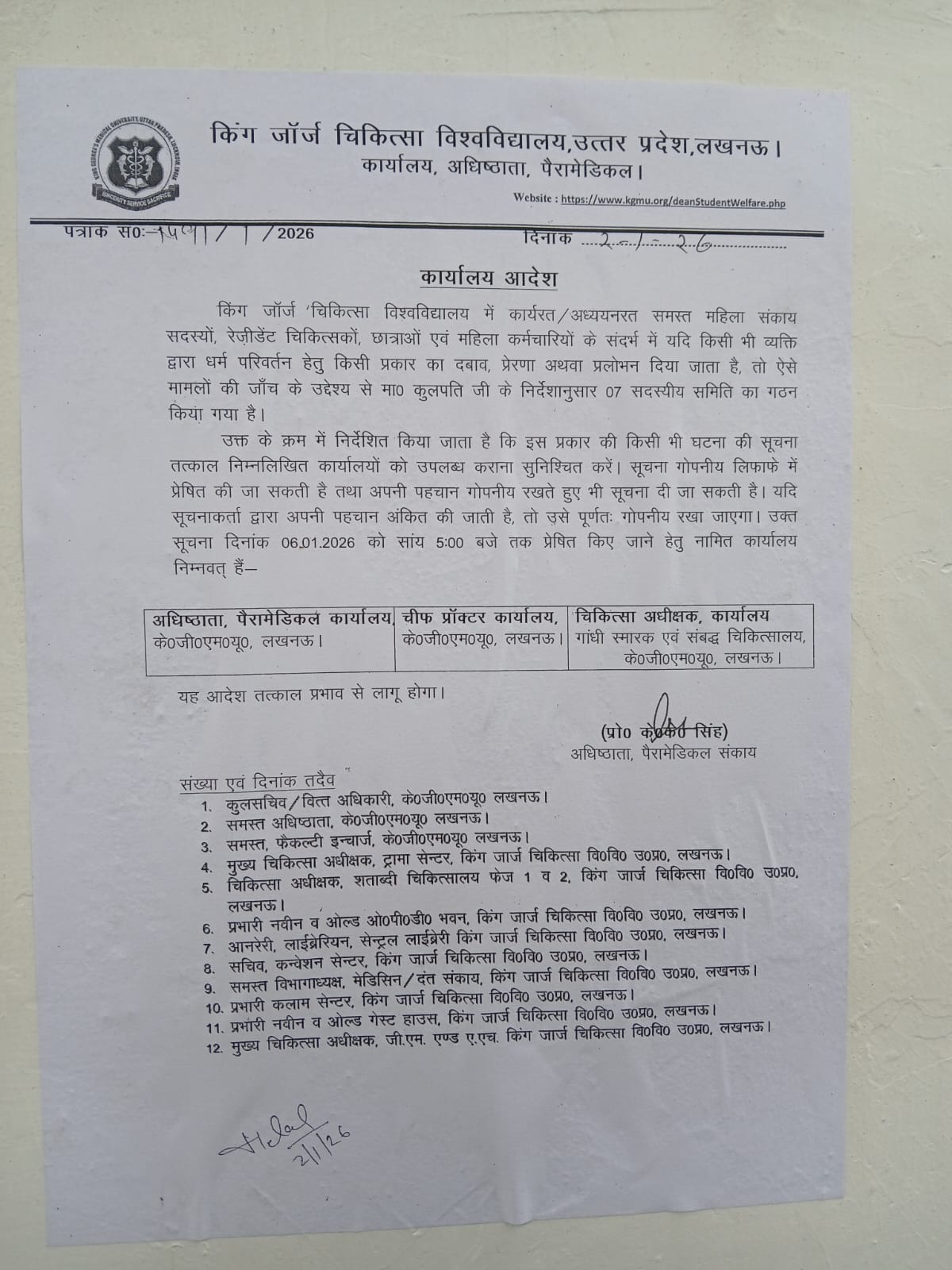 अब केजीएमयू प्रशासन ने एक नोटिस जारी की है जिसे प्रमुख विभागों अथवा अधिकारियों के कार्यालय पर चस्पा किया गया है। केजीएमयू पैरामेडिकल संकाय के अधिष्ठाता व केजीएमयू प्रवक्ता ने यह पत्र जारी किया है। जिसमें कहा गया है कि धर्म परिवर्तन के लिए किसी प्रकार का दबाव, प्रेरणा अथवा प्रलोभन दिया गया हो तो वह शिकायत कर सकता है। इतना ही नहीं इसकी सूचना कोई भी बंद लिफाफे में केजीएमयू प्रशासन अथवा जांच समिति को दे सकता है। जिसकी जानकारी पूर्णतया गोपनीय रखी जाएगी, लेकिन यह जानकारी 6 जनवरी शाम 5 बजे तक दी जा सकती है।