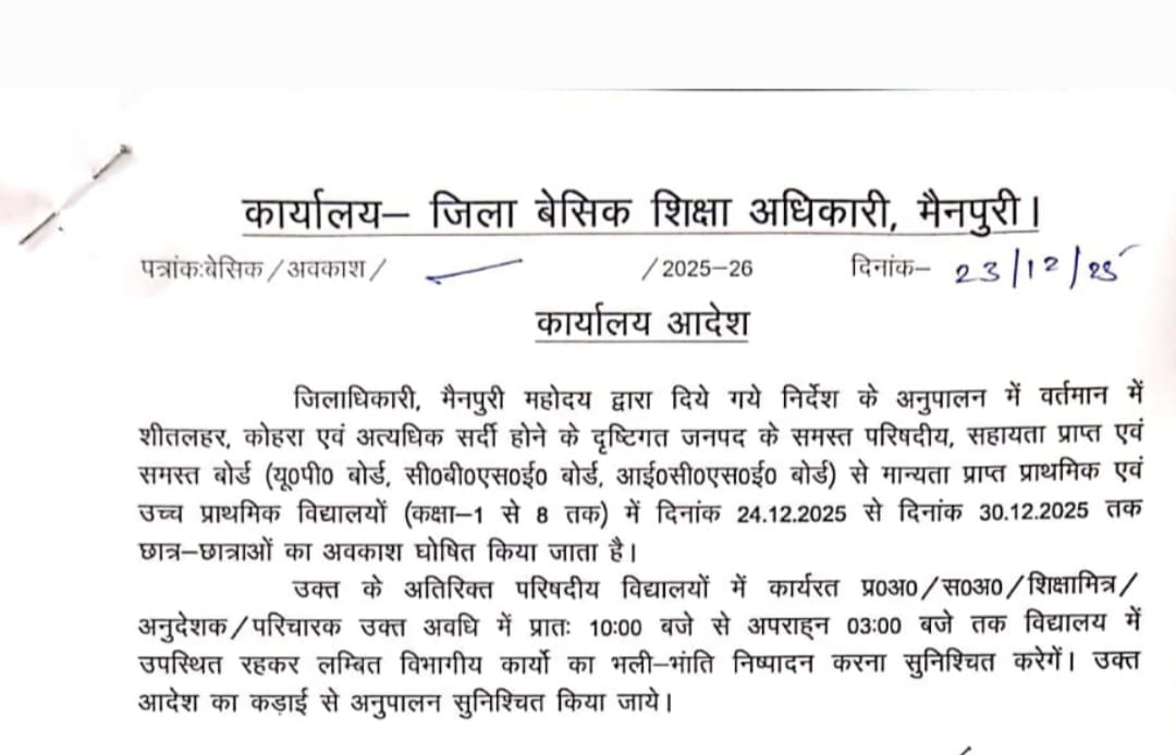 Mainpuri : जनपद मैनपुरी में जिलाधिकारी के निर्देश पर जनपद में शीतलहर, घना कोहरा और अत्यधिक ठंड को देखते हुए बड़ा फैसला लिया गया है। जनपद के समस्त परिषदीय, सहायता प्राप्त एवं सभी बोर्डों (यूपी बोर्ड, सीबीएसई, आईसीएसई) से मान्यता प्राप्त प्राथमिक एवं उच्च प्राथमिक विद्यालयों में कक्षा 1 से 8 तक के छात्र-छात्राओं के लिए 24 दिसंबर 2025 से 30 दिसंबर 2025 तक अवकाश घोषित किया गया है।