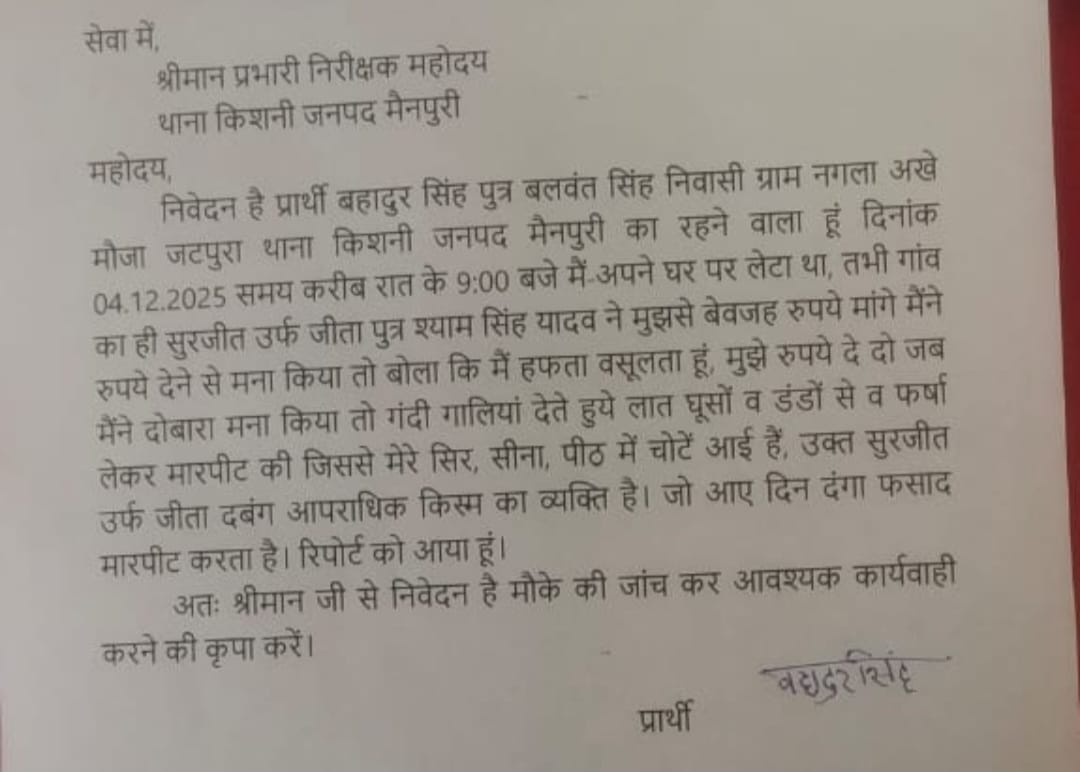 जानकारी के अनुसार, गांव निवासी शिकायतकर्ता बहादुर सिंह ने पुलिस को दिए प्रार्थना पत्र में गांव के ही सुरजीत उर्फ “जीता” पुत्र श्याम सिंह पर गंभीर आरोप लगाए हैं। पीड़ित के अनुसार, 04 दिसंबर 2025 की देर रात करीब 9 बजे वह अपने घर पर आराम कर रहा था, तभी आरोपी सुरजीत उर्फ जीता वहां पहुंचा और बिना वजह रुपये की मांग करने लगा। बहादुर सिंह द्वारा रुपये देने से इंकार करने पर आरोपी बौखला गया और खुद को “हफ्ता वसूलने वाला” बताते हुए धमकाने लगा।